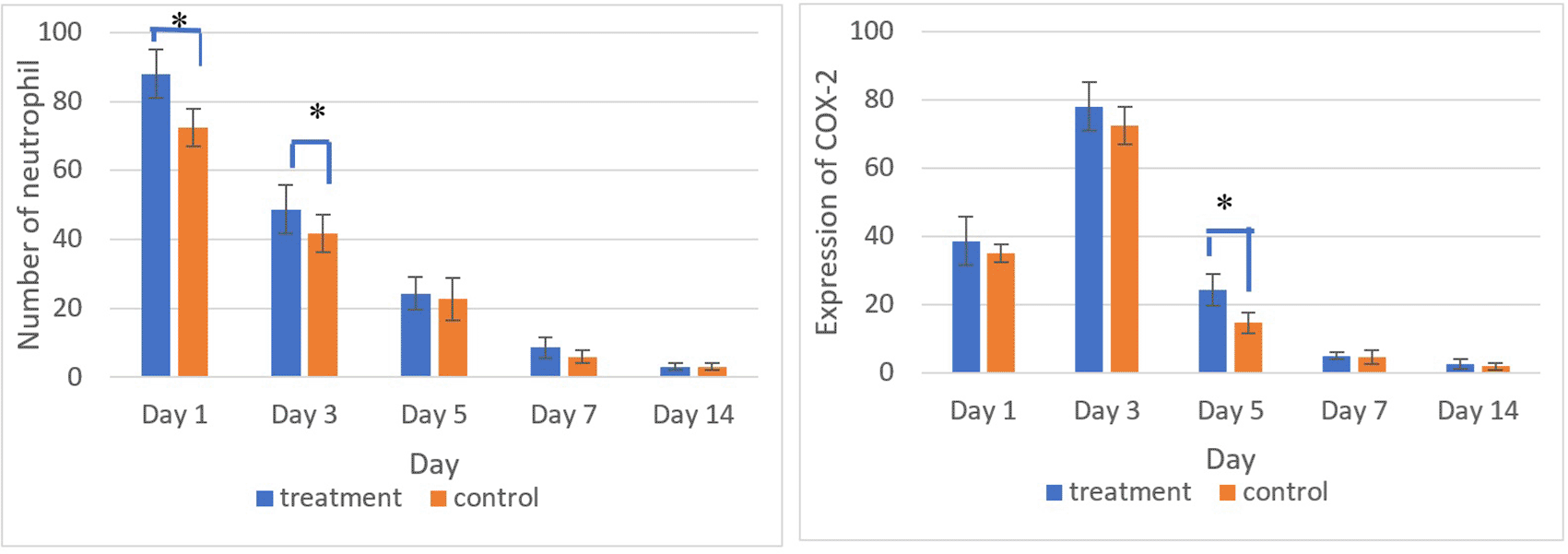 There was a significant difference in the number of neutrophils between the treatment and control group on the 1st and 3rd days and COX-2 expression on the 5th day (*) (p<0.05).