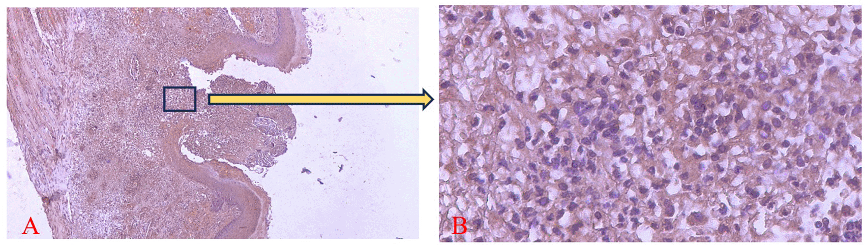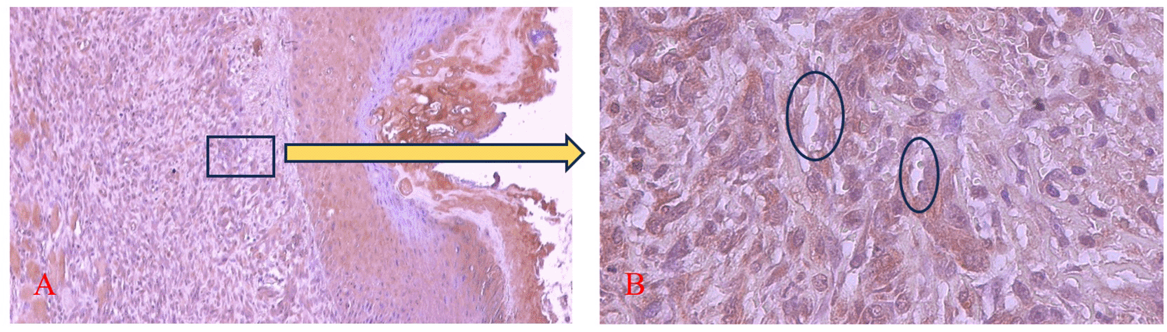 The brown color was seen in endothelial cells (Ο), fibroblasts, and inflammatory cells in the ulcer area. Magnification 100x (A) and 400x (B).