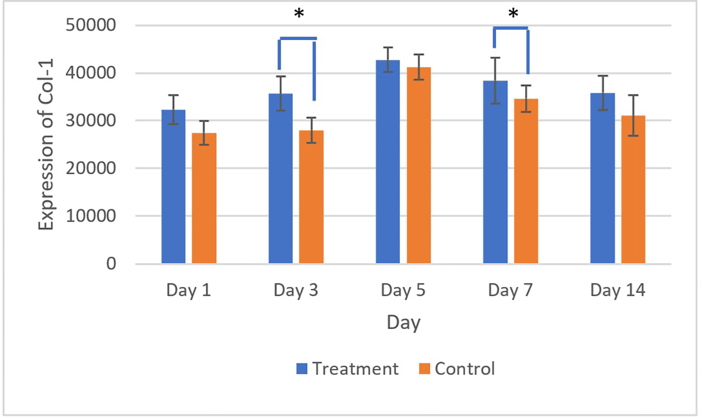 There was a significant difference in Col-1 expression on 3rd and 5th days (*) (p<0.05).