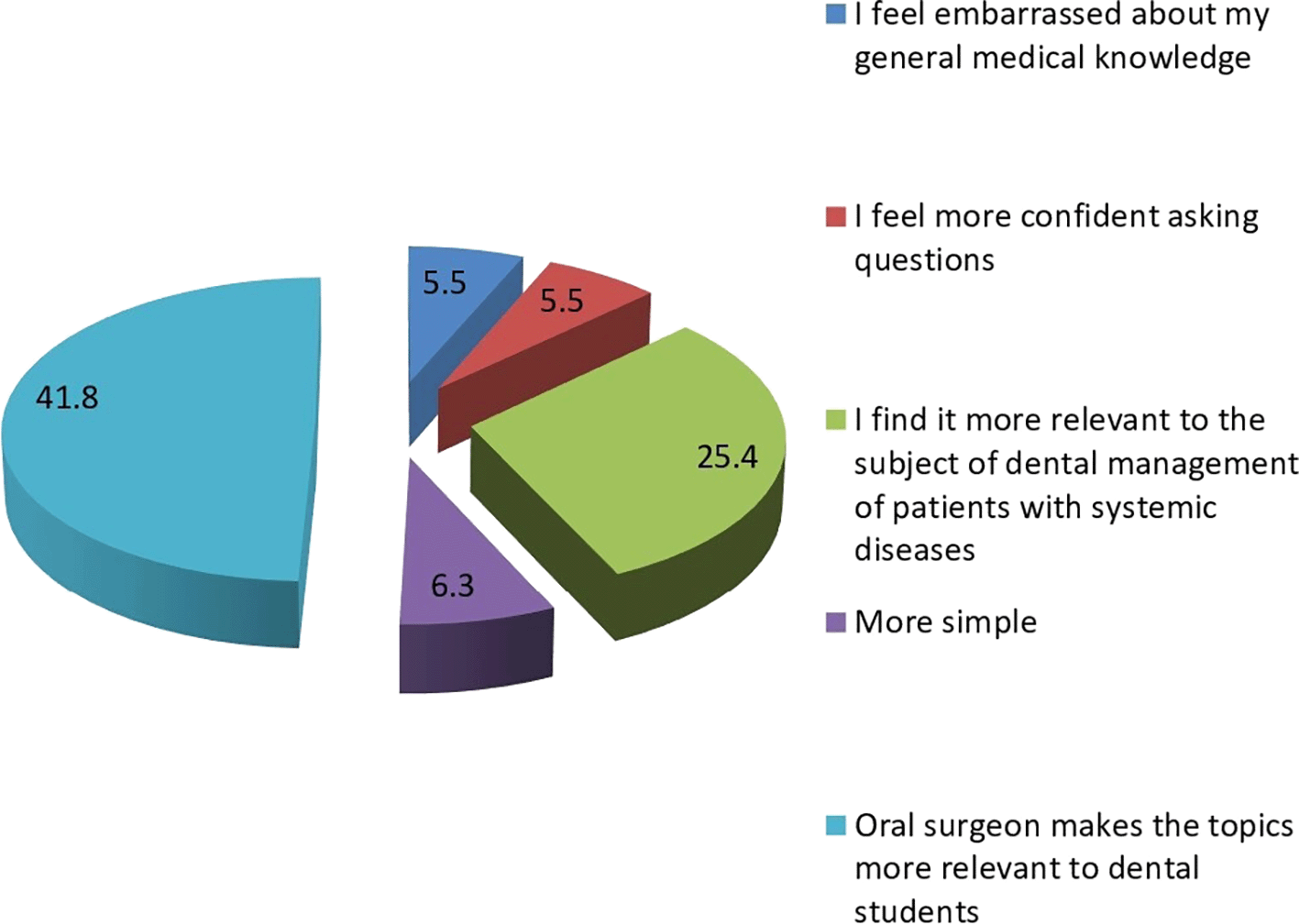 Figure 3 shows that students who think GS helps better understand OS have a comfortable majority among the participants. However, students think that GS could help to some extent in understanding OS is higher than students who think GS could provide considerable help in this matter. Understandably, the Chi-Square Test showed a highly significant relationship (P = 0.000) between the relevance of GS to OS and the extent to which GS help in understanding OS. Surprisingly, a considerable majority of the students (almost 70%) wished to become oral and maxillofacial OMF surgeons ( Table 1). This wish does not seem to be influenced by the students’ gender. The chi-square Test showed no statistically significant difference (P = 0.313) between males and females in their willingness to become OMF surgeons. General surgery lectures were given by an oral surgeon to approximately two-thirds of the participants. This percentage is comparable to the percentage of students who wish to receive GS lectures by oral surgeons. Similarly, the percentage of students who were given the subject by a physician and the percentage of students who were given general surgery lectures by a physician. The reason for the students’ preferences toward the oral surgeon is illustrated in Figure 4. Around half of the respondents prefer GS to be given by an oral surgeon as he/she makes the subject more relevant to dentistry. Another important reason is related to the fact that GS, when performed by an oral surgeon, helps to better understand the management of systemic diseases from a dental perspective. Other reasons, such as simplicity, embarrassment, and being more comfortable asking questions, share a minority of the remaining responses.