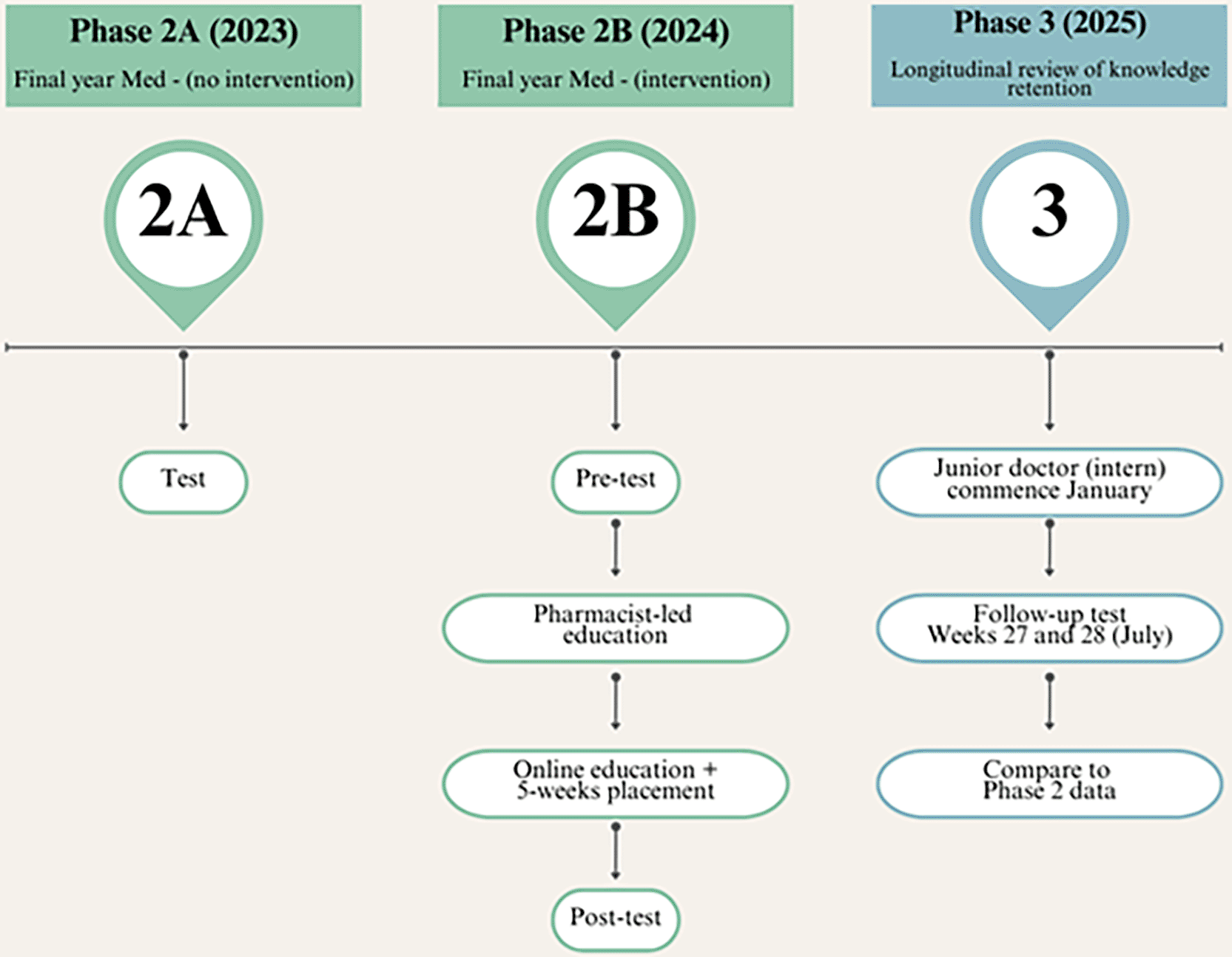 Mokrzecki et al. phase-1 study identified that final-year medical students’ preference is a multimodal education package on the skill of prescription writing delivered by a pharmacist during standard placement blocks with hands-on experiences (workshops) and tutorials.2 These preferences assisted in developing the intervention methods presented. Final-year medical students from 2023 (Phase 2A) completed only the online prescription writing test to ensure content validity during the intervention phase (phase 2B). Phase 2A testing was conducted in a whole cohort session, where participants were then offered the face-to-face education package to meet ethics criteria.