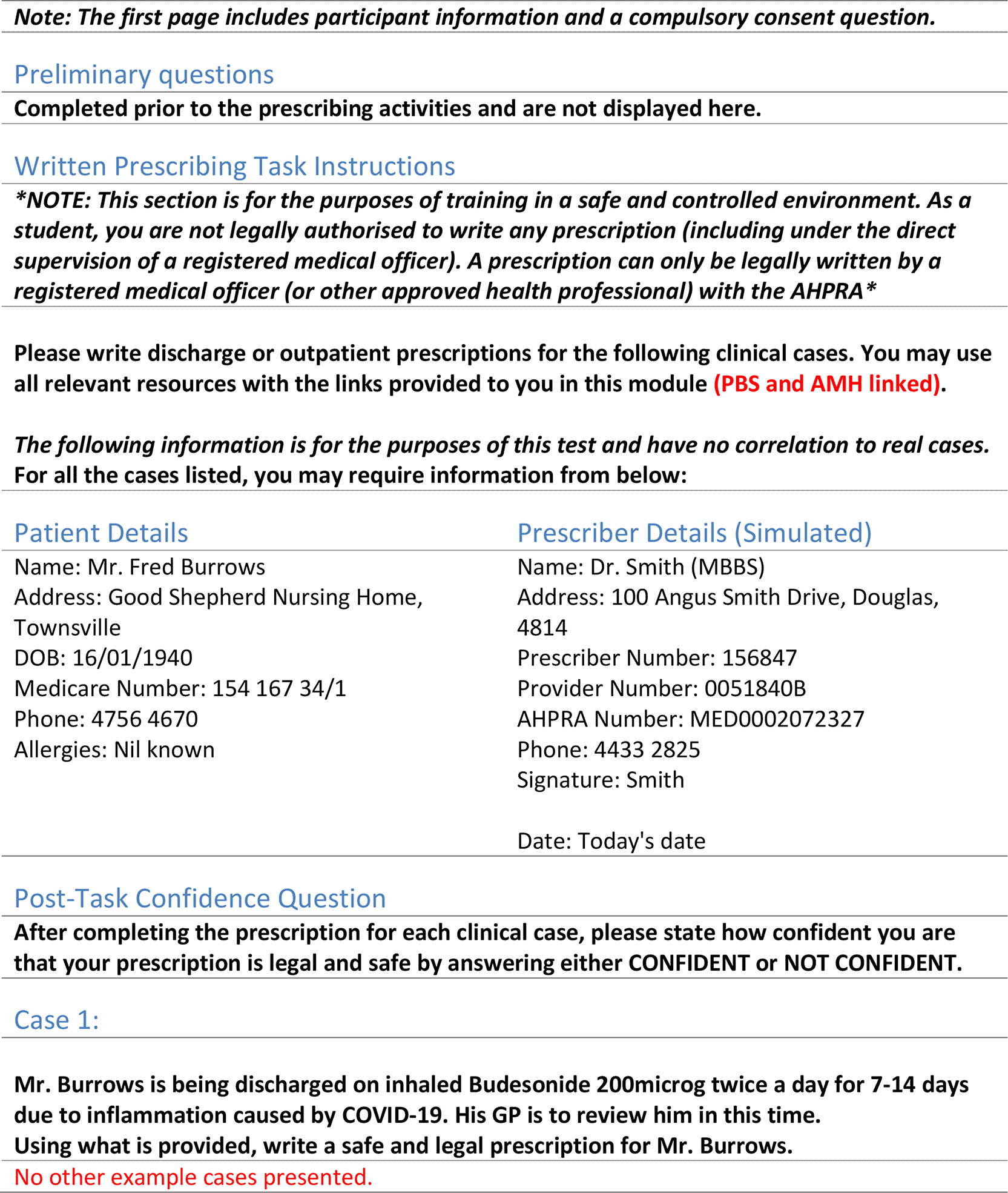 Placement blocks vary in duration and expose students to a variety of specialties. Not all students complete identical placement rotations at the same time. The JCU curriculum, like many other curricula, focuses more on therapeutic choice (for example, choice of drug, dose and route) rather than the technical skill to writing a medication prescription, which is the focus of this study. In 5th year, students receive an introduction to prescribing as per the Pharmaceutical Benefits Scheme (PBS). Students are not assessed on this information and have limited opportunity to practice writing a prescription. Any other learnings on prescription writing are opportunistic or self-directed. Anecdotally, medical students have written medication prescriptions and had an authorised prescriber countersign, but this process is not legal. This study provided a protected environment for participants to practice writing a medication prescription, which is an essential skill that does not have mandated assessment in Australia.