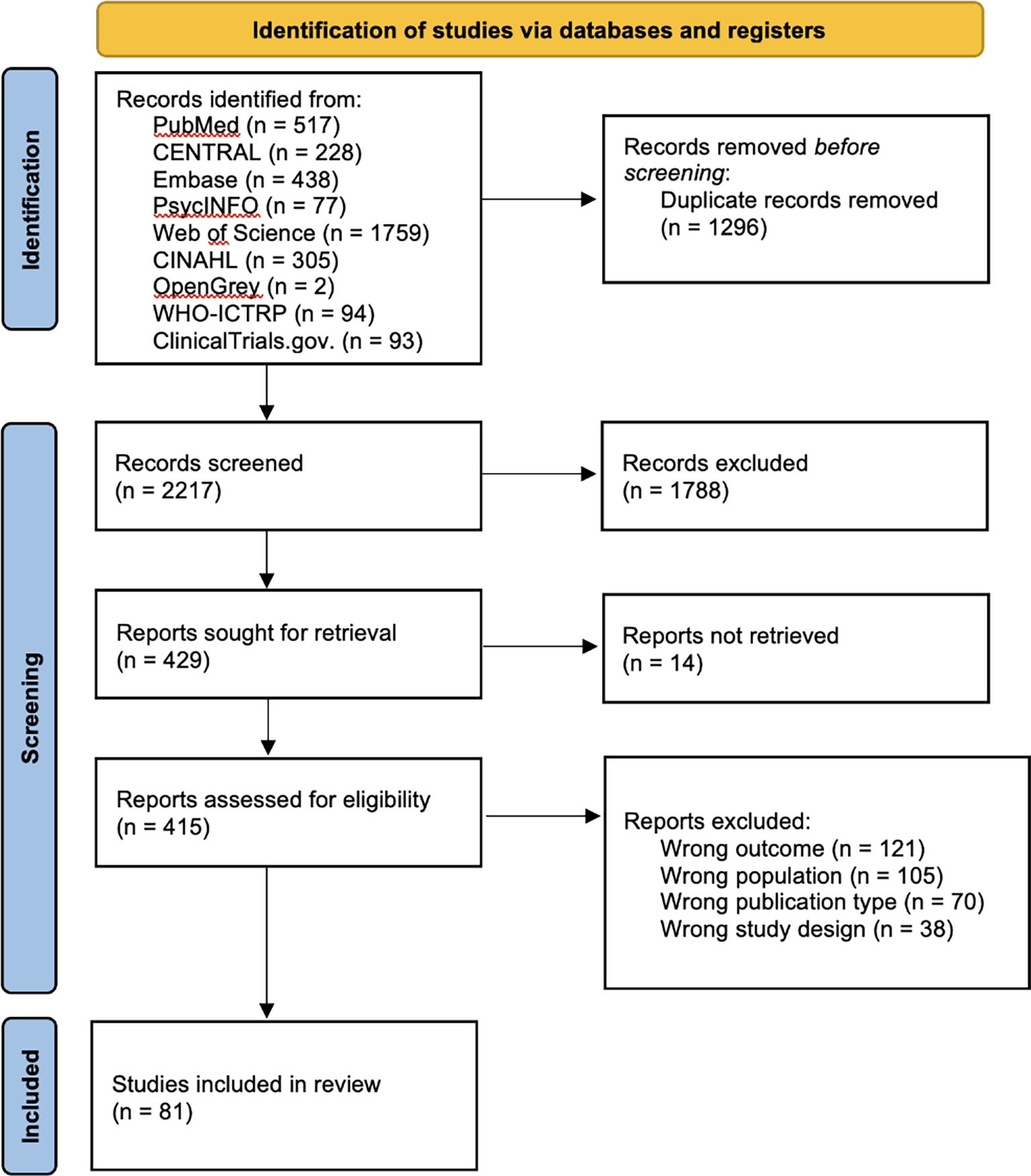 A total of 3,513 articles were retrieved during the database search. After eliminating 1,296 duplicates, the titles and abstracts of 2,217 articles were screened. Thereafter, the full texts of the remaining 415 articles were assessed for eligibility. Ultimately, only 81 studies that met the eligibility criteria were included in the analysis ( Figure 1).