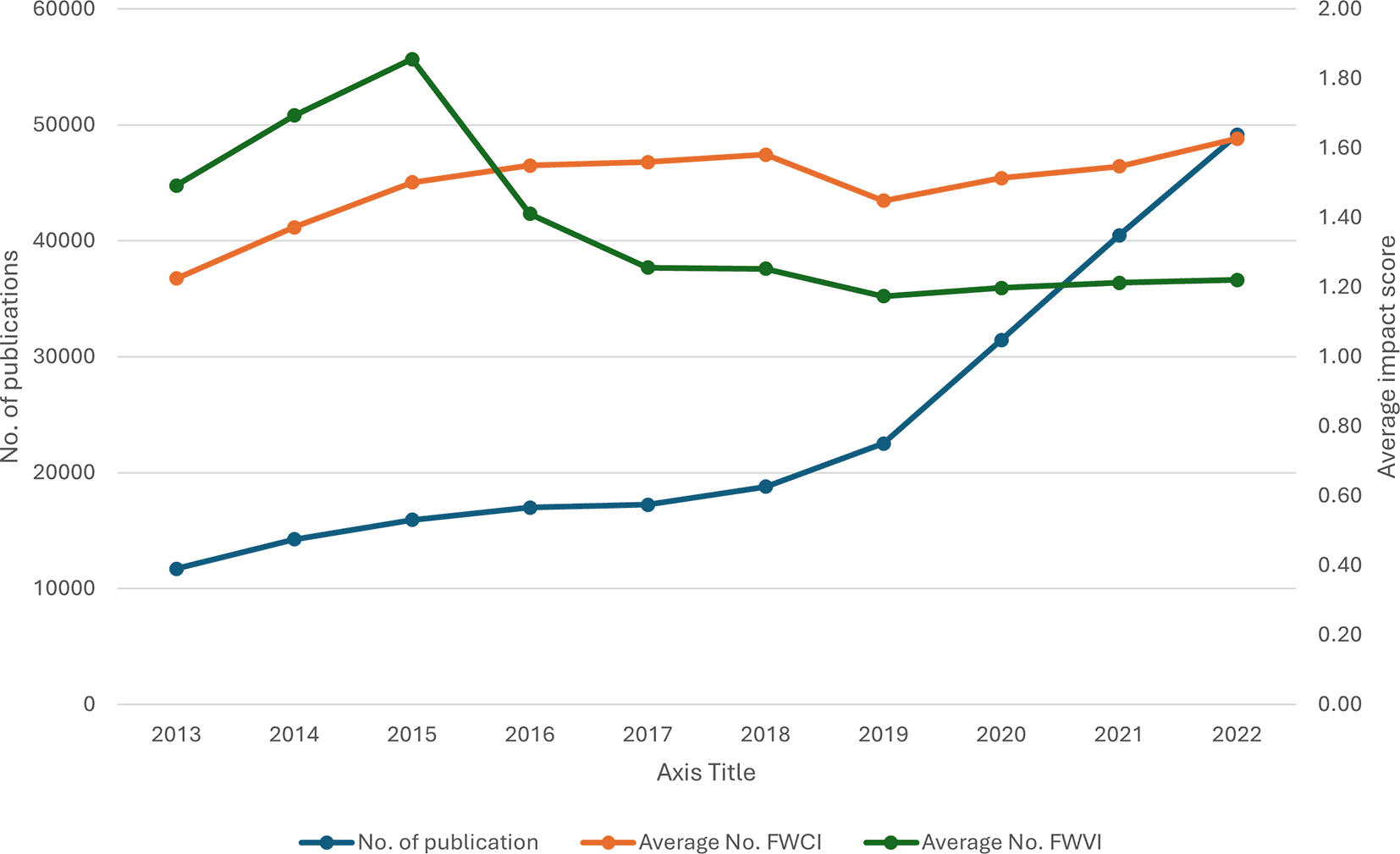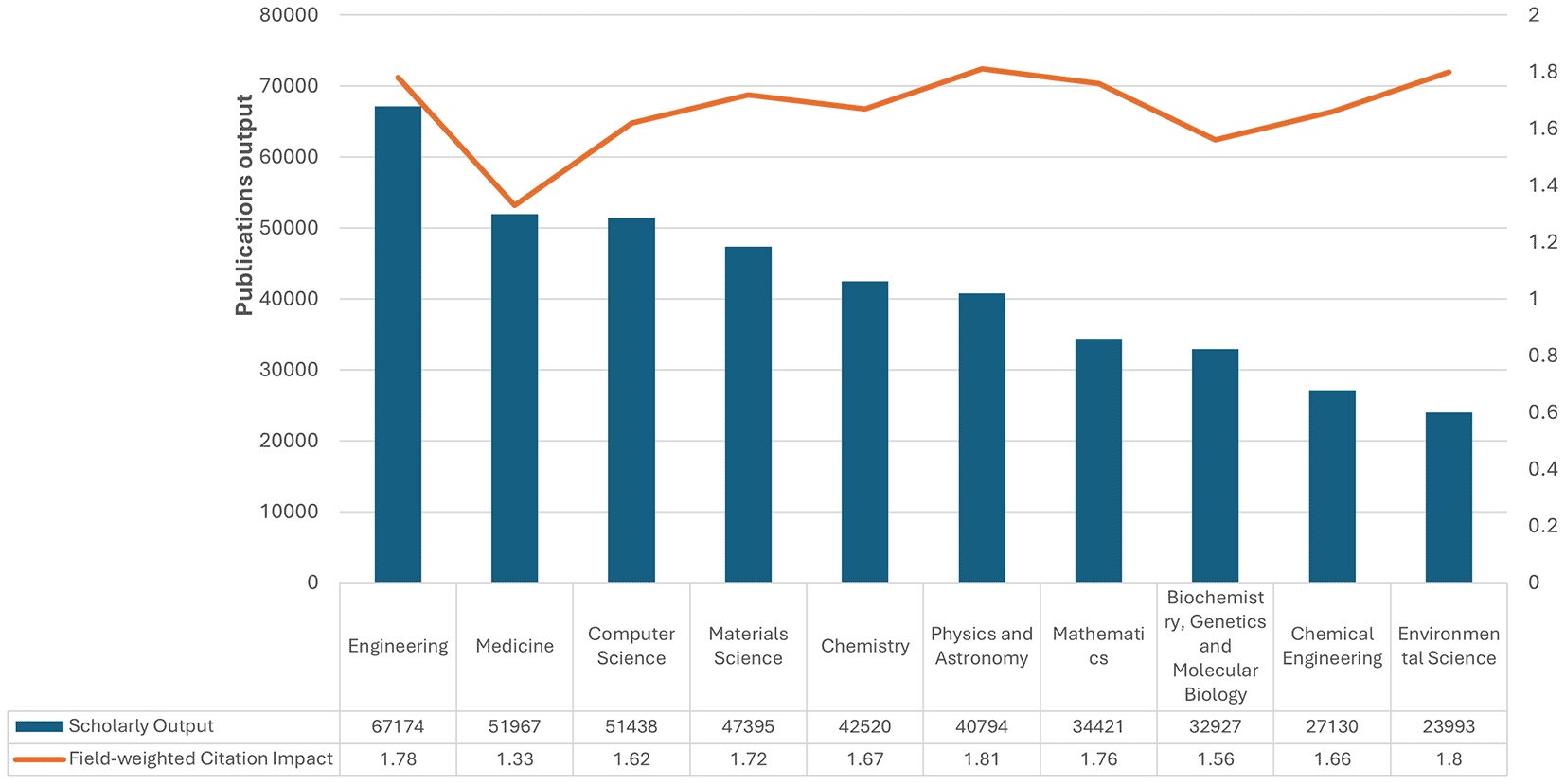 Figure 2 Saudi Arabia’s scholarly output and field-weighted citation impact, 2013–2022: There is clearly substantial variation across research productivity and impact. While leading in the volume of scholarly outputs at 67,174 publications, the field-weighted citation impact was almost lower at 1.78 than that of other disciplines. Medicine followed with 51,967 and a citation impact of 1.33. In the fields of computer science and materials science, large outputs are found, with 51,438 and 47,395 publications, respectively, with higher citation impacts of 1.62 and 1.81, respectively, and thus more substantial influence per publication. Chemistry, Physics, Astronomy, and Mathematics also have well-balanced contributions, with outputs of 42,520–34,421 and citation impacts of approximately 1.67–1.76. Although lower outputs can be found in biochemistry, genetics, and molecular biology, with 32,927, their impact of 1.56 is remarkable. Another example includes Chemical Engineering and Environmental Science, with outputs of 27,130 and 23,993, respectively, which amount to robust citation impacts of 1.66 and 1.80. These data demonstrate the diverse research landscape in Saudi Arabia, which manifests high productivity and considerable implications across many fields of science.