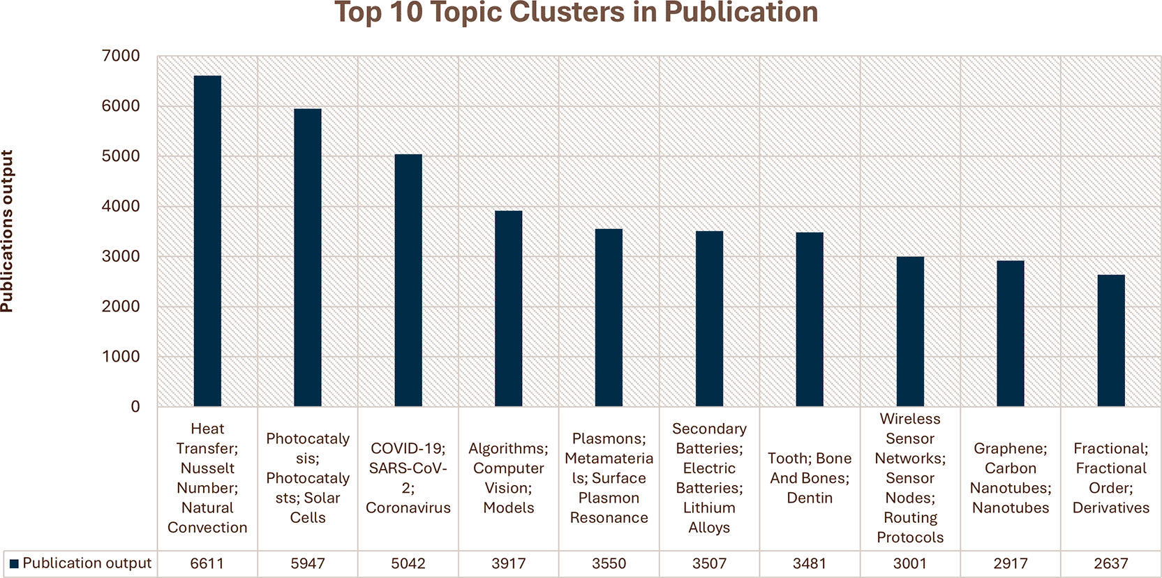As shown in Figure 3, the top 10 research topics in Saudi Arabian publications for the period from 2013–2022 range from a wide array of focus areas, thereby underpinning the breadth of research initiatives the country has undertaken. For heat transfer, the Nusselt number is the most prolific cluster, with nearly 7,000 publications, underlining a strong orientation toward thermodynamics and related engineering applications. The next ones are “Photocatalysis” and “COVID-19; SARS-CoV-2,” with over 5,000 publications each, reflecting global and regional priorities in renewable energy solutions and pandemic-related research. Other key clusters are “Algorithms, Computer Science,” “Plasmons, Metamaterials,” and “Secondary Batteries,” each contributing 3,000–5,000 publications on improvements in computational techniques, nanotechnology, and energy storage technologies. Intense research has also been conducted in “Tooth; Bone and Bones,” “Wireless Sensor Networks,” “Graphene; Carbon Nanotubes,” and “Fractional; Fractional Calculus,” all with large outputs, which thus focus on biomedical engineering and communication technologies, as well as advanced materials science. This broad list of productive research areas highlights the comprehensive and multidisciplinary approach Saudi Arabia has toward scientific inquiry.