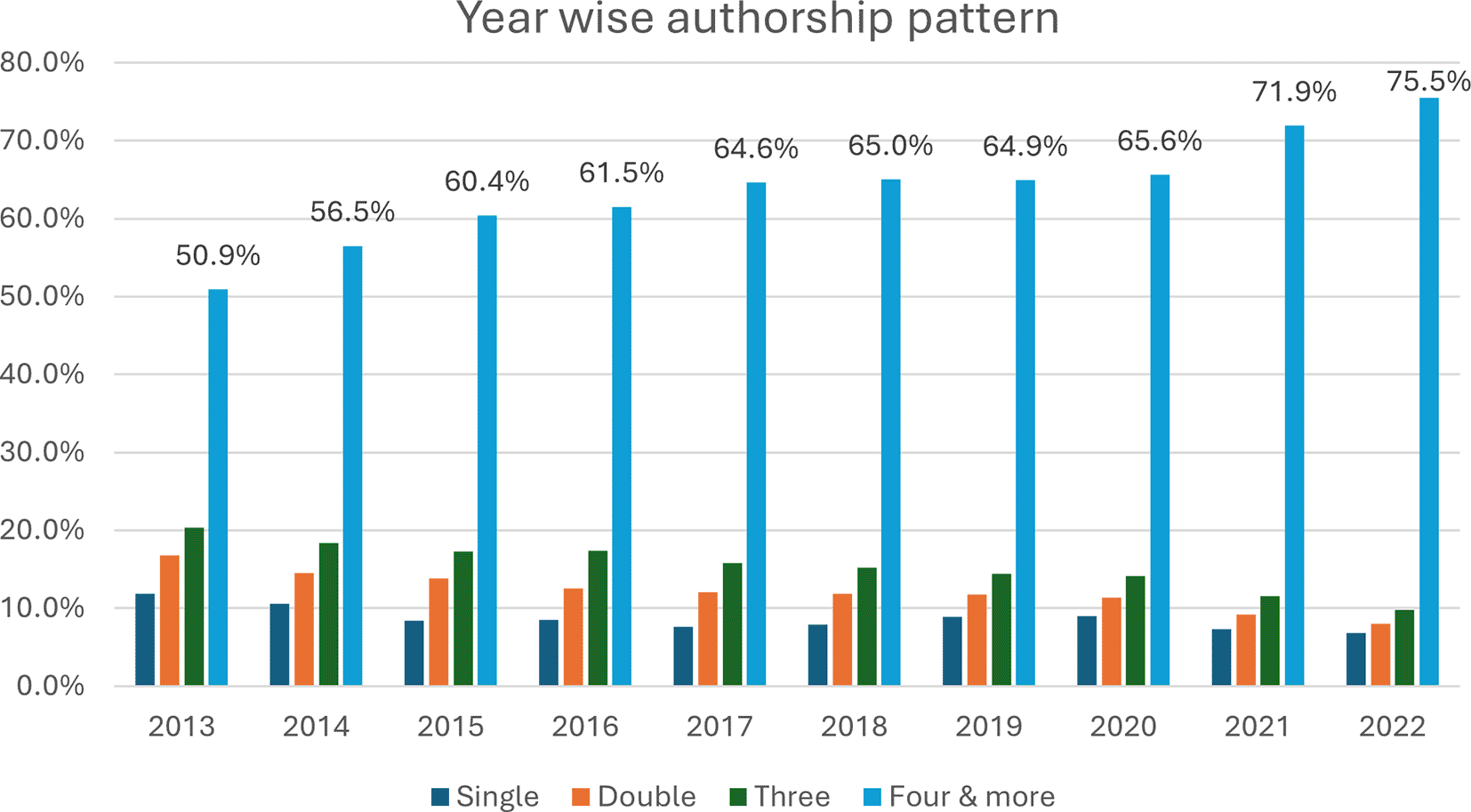 Figure 4 represents a comprehensive view of authorship trends in academic publications over a decade, from 2013–2022. The number of authors per publication is based on the figure provided, and we can observe trends and changes in authorship over the years. A Kruskal–Wallis H test was used to compare the median number of authorships per publication across the years, resulting in a p value of 0.001. The data highlight that the median number of authors per article increased from four (IQR: 1–2263) in 2013 to six (IQR: 1–2302) in 2016. This highlights that the median number of authors per publication has shown a clear upwards trend and that the number of authors per paper has significantly increased over the 10-year period (P <0.001). The data from 2013–2022 show a clear pattern of decreasing isolated events (singles and doubles) and a corresponding increase in larger clusters (three occurrences and four or more occurrences). In 2013, publications with four or more authors constituted 50.9% of the total, and this proportion grew to 75.5% by 2022. In 2013, single-author publications made up 11.9% of the total, but by 2022, this figure had dropped to just 6.8%. This decline reflects a growing trend towards collaborative research.