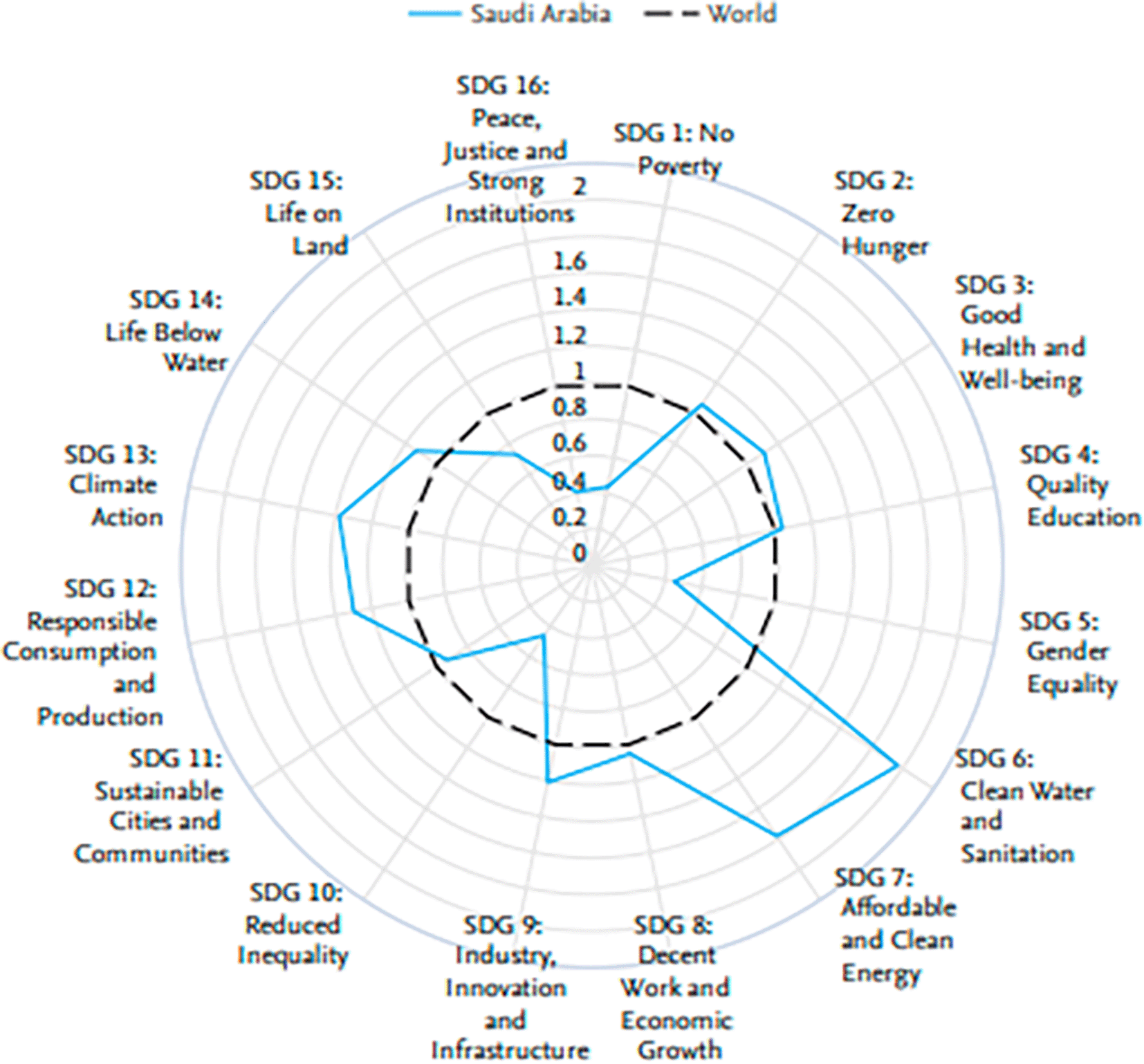 The radar chart in Figure 5 reveals Saudi Arabia’s excellent performance on some of the United Nations Sustainable Development Goals, 2013–2022, against the world average. Saudi Arabia is exemplary in SDG 7, Affordable and Clean Energy, and SDG 9, Industry, Innovation, and Infrastructure, above the world average. This redundantly underlines that this nation is rightly committed to developing clean energy agendas and infrastructural development. Moreover, Saudi Arabia performs well with respect to SDG 16 in terms of peace, justice, and strong institutions and with respect to SDG 8 in terms of decent work and economic growth, hence truly succeeding in building a society that works both stably and moderately and is economically dynamic. This means that the country does show its commitment to sustainable development and what it has been able to do thus far in taking concrete initiatives toward pursuing some of the critical global challenges that affect humankind.