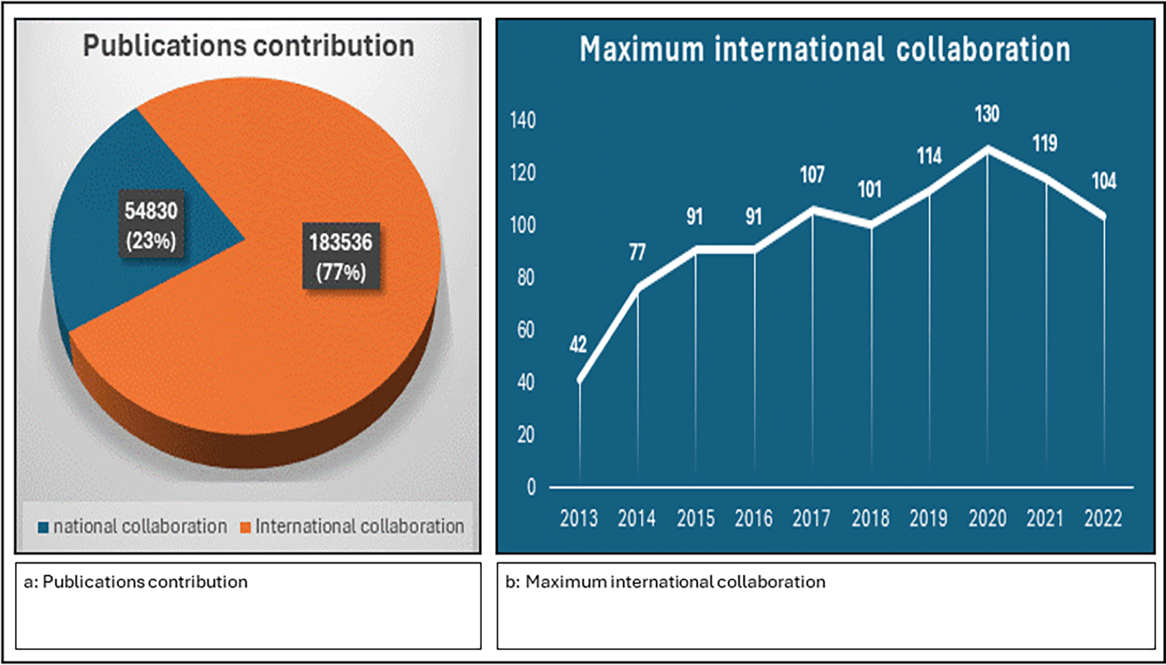The data on publications from national and international collaborations paint a vivid picture of the evolving landscape of scientific research. A higher count of publications suggests international collaboration and greater visibility, knowledge exchange, and potential for broader societal impact. International collaborations clearly dominate in terms of sheer volume, reflecting the global nature of modern scientific inquiry and the increasing emphasis on cross-border collaboration, as shown in figure international collaboration accounts for a substantial majority of the output (183,536 publications; 77%), while nationally collaborative publications constitute a smaller proportion (54,830 publications; 23%) ( Figure 6a). The data provided the maximum number of international collaborations for each year from 2013–2022, as shown in Figure 6b. The maximum number of international collaborations varied each year, ranging from 42 in 2013 to 130 in 2020. There are fluctuations in the maximum number of international collaborations across the years, with some years experiencing significant increases or decreases compared with the previous year, with 2020 standing out as the year with the highest maximum international collaborations, reaching 130.