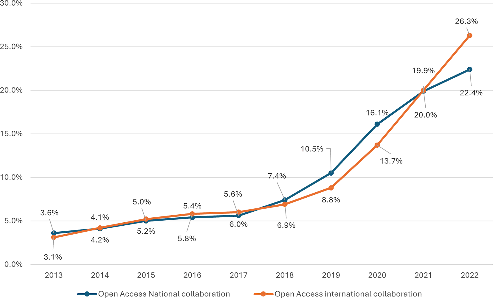 Both national and international open access collaboration have shown a consistent upwards trend over the observed period, as shown in Figure 8. The percentage of open access publications from national collaborations started at 3.6% in 2013 and increased steadily each year, reaching 22.4% by 2022. This growth is notable, showing a more than sixfold increase over the decade. Significant annual increases are observed, particularly from 2018 onwards, where the percentage jumped from 7.4% to 10.5% in 2019, marking a substantial 3.1% increase in a single year. The highest growth rate was observed between 2019 and 2020, with a 5.6% increase. International collaboration in open access started slightly lower than national collaboration at 3.1% in 2013 but experienced a more dramatic rise, reaching 26.3% by 2022. This represents an eightfold increase. The data reveal a steady increase each year, with notable jumps between 2019 and 2020 (from 8.8% to 13.7%) and a significant increase from 2021 to 2022 (from 20.0% to 26.3%). These jumps suggest potential influences on increasing global research networks. In conclusion, a positive correlation of r = 0.979, p value = 0.001 between national and international open access publications in Saudi Arabia indicates a powerful relationship, suggesting that efforts to promote research in open access publications effectively contribute to both national and international scholarly outputs.