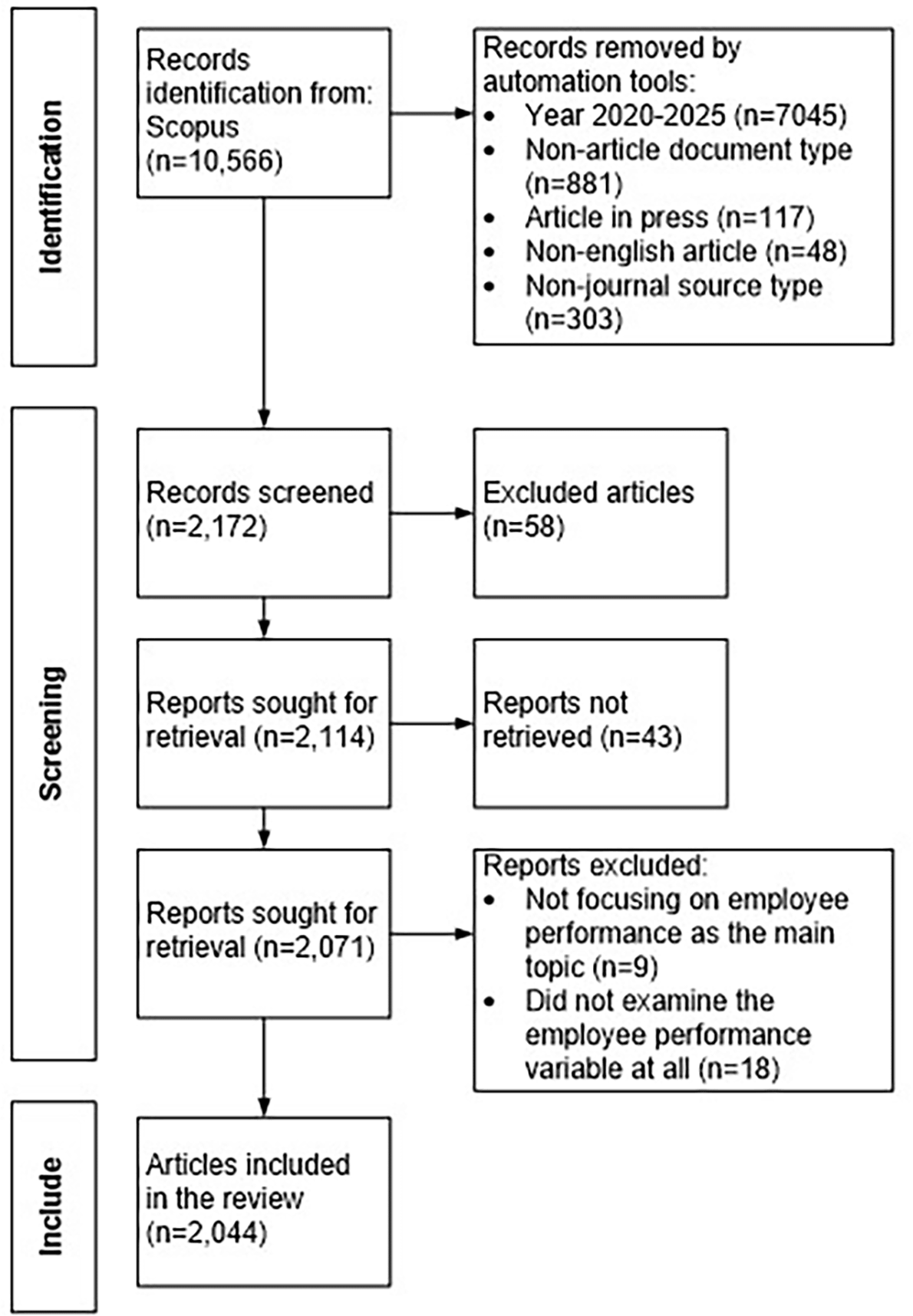 A total of 2,114 articles meets the criteria. In the eligibility stage, the full texts of 2,071 articles are reviewed, and 27 articles are excluded due to incomplete information or failure to address employee performance as a central topic. This leaves 2,044 articles that meet all inclusion criteria. In the final inclusion stage, these 2,044 articles are incorporated into the bibliometric analysis. The entire selection process is summarized in the PRISMA flow diagram presented in Figure 1.