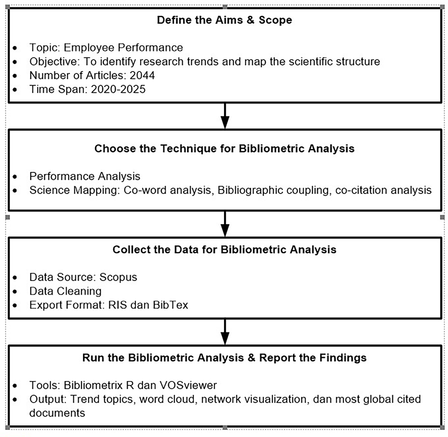 The initial step in this bibliometric analysis is to clearly define the focus and scope of the study. This research aims to identify research trends and map the intellectual structure in the field of employee performance over the past five years (2020-2025). With the topic becoming increasingly relevant in the dynamics of modern organizations, this study explores patterns of scientific contributions, the influence of dominant literature, and the mapping of intellectual relationships between topics in the field. The scope of the study includes 2,044 scholarly articles obtained from the Scopus database, which is considered to have broad coverage and high academic quality in documenting global literature.