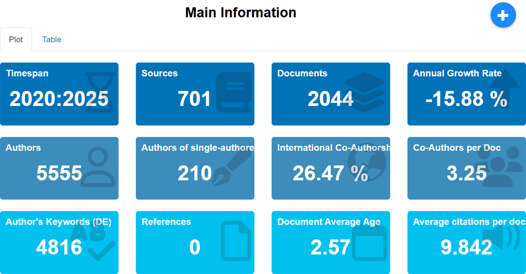 Main Information provides a summary of the general characteristics of the articles analyzed in this study, which includes a total of 2,044 from 10,566 documents related to employee performance published between 2020 and 2025, obtained from the Scopus database. The displayed information includes the number of publication sources, number of authors, level of international collaboration, average document age, frequency of used keywords, and average citations per document. A detailed breakdown of this descriptive information can be seen in Figure 3 below.