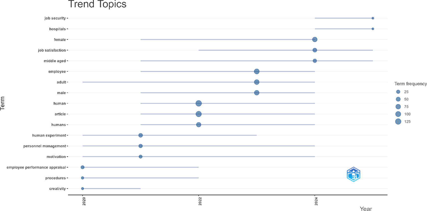 The analysis of topic trends in employee performance research from 2020 to 2025 reveals a shift in thematic focus that reflects the adaptive dynamics of scientific inquiry in response to the social context and needs of modern organizations. At the beginning of the period, the emerging themes were still general, such as “human” and “article”, indicating a conceptual focus on individual entities and systematic approaches in scholarly publications. However, as time progressed, researchers’ attention began to shift toward more specific issues, as reflected in the consistent appearance of terms like “personnel management”, “adult”, and “motivation” from 2020-2021 through 2024. These terms show a research trend toward exploring managerial and psychological dimensions related to the management of adult employees and intrinsic motivating factors within organizational contexts.