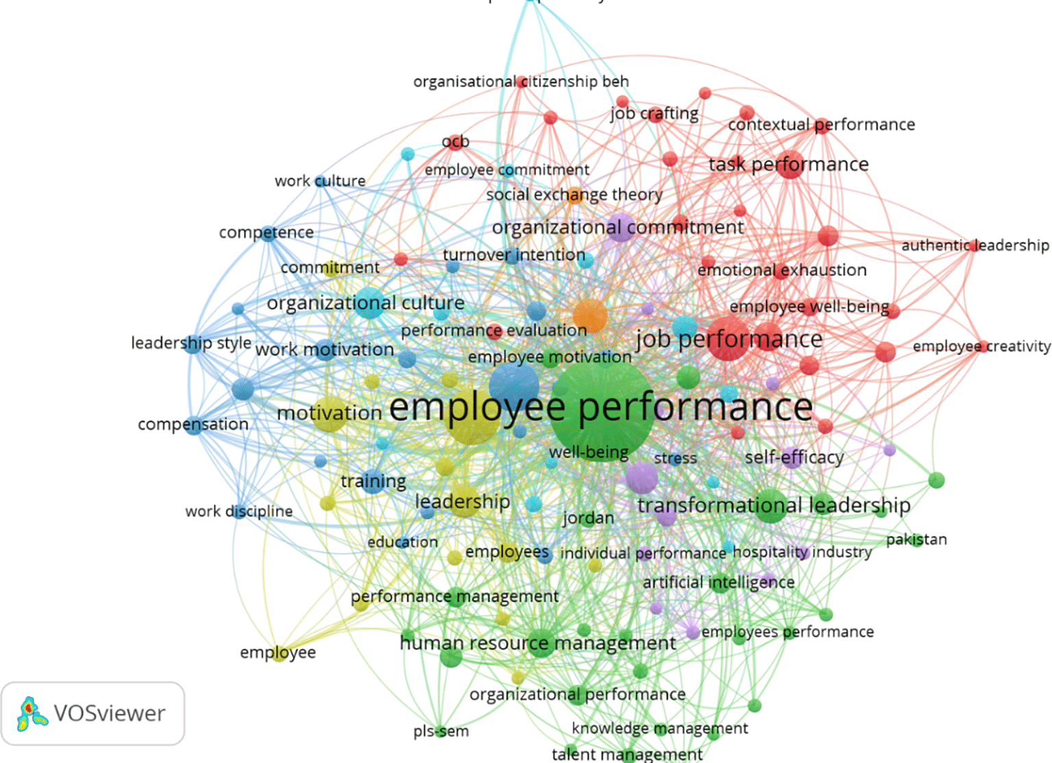 The network visualization results from the VOSviewer export in employee performance research successfully map seven main clusters, each representing a thematic focus in the literature over the past five years. The VOSviewer output, in the form of a network visualization, is shown in Figure 6.