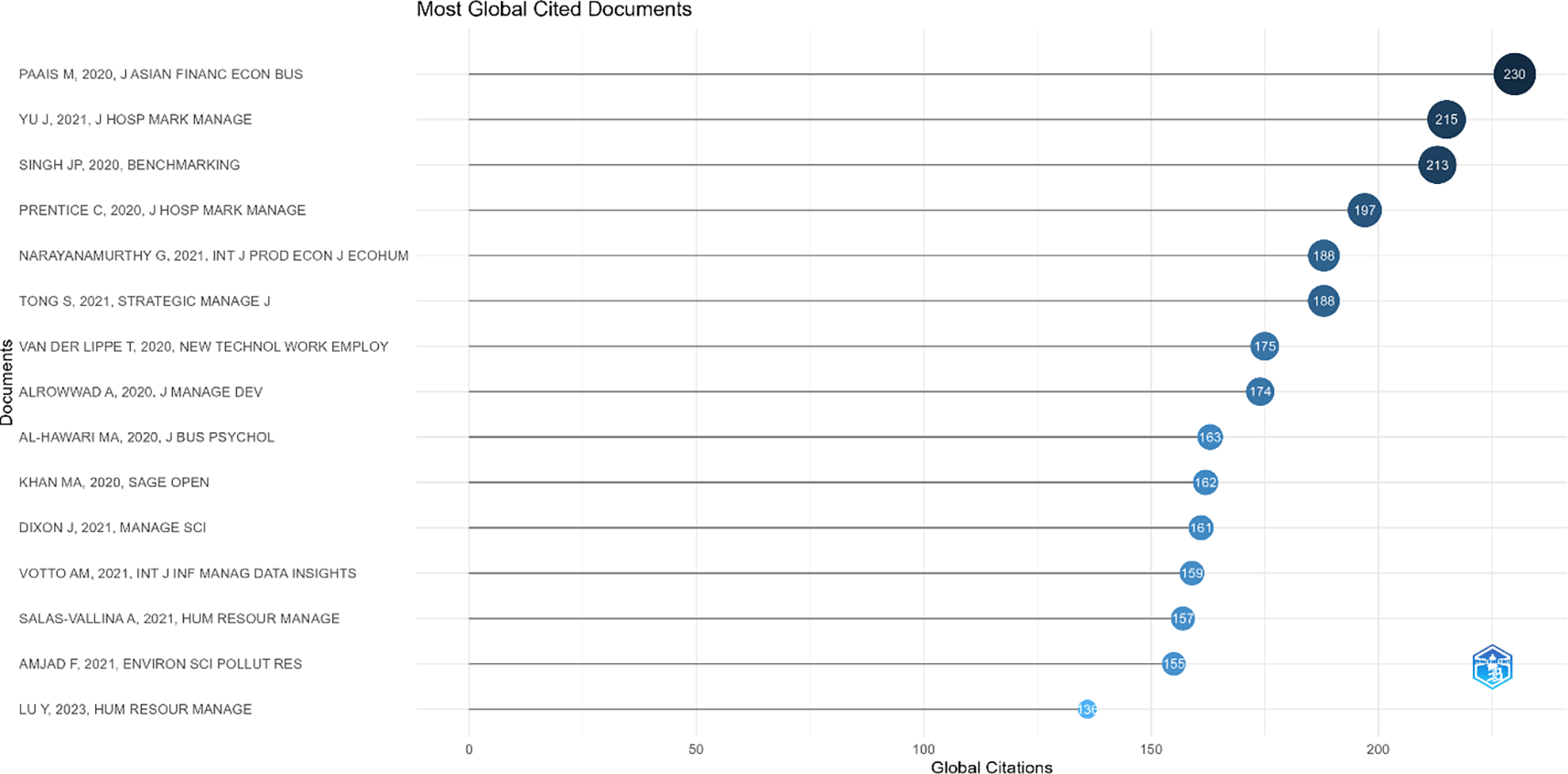 Based on Figure 7, the visualization and tabular data of the Most Globally Cited Documents indicate that the article by Paais and Pattiruhu,37 titled Effect of Motivation, Leadership, and Organizational Culture on Satisfaction and Employee Performance, published in the Journal of Asian Finance, Economics and Business, is the most globally cited work, with 230 citations and an average of 38.33 citations per year. It is followed by the works of Yu et al.38 and Singh et al.,31 with 215 and 213 citations, respectively, also indicating a very high level of scientific influence. Other articles, such as Prentice et al.39 and Narayanamurthy & Tortorella,40 also record significant citations, indicating high relevance in the literature related to employee performance.