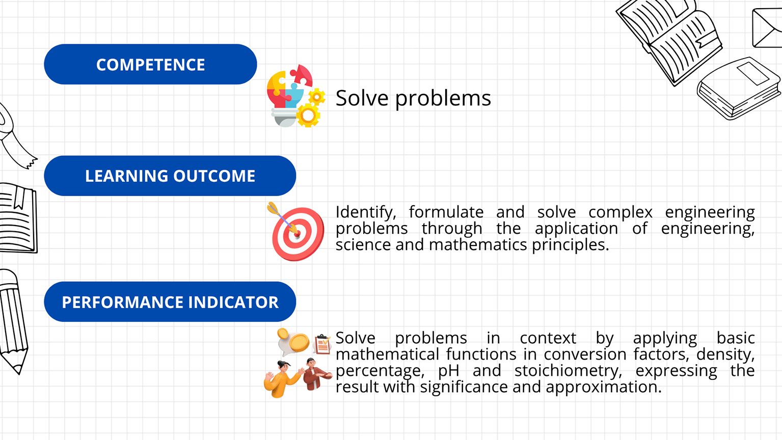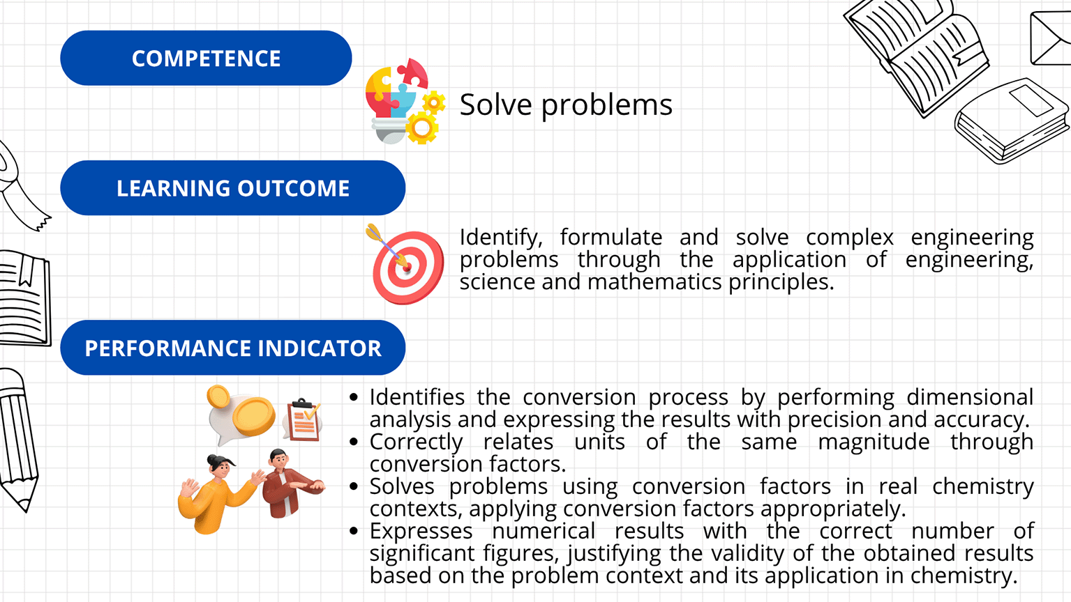 Assurance of Learning is a process focused on ensuring the quality and effectiveness of education. It involves implementing practices, policies, and procedures intended to ensure the development of skills, competencies, and knowledge expected in a specific educational program or course. In the subjects Chemistry and General Chemistry I at the Universidad de La Sabana, persistent issues with low academic performance have resulted in rising course repetition rates, lack of motivation, and student dropout.