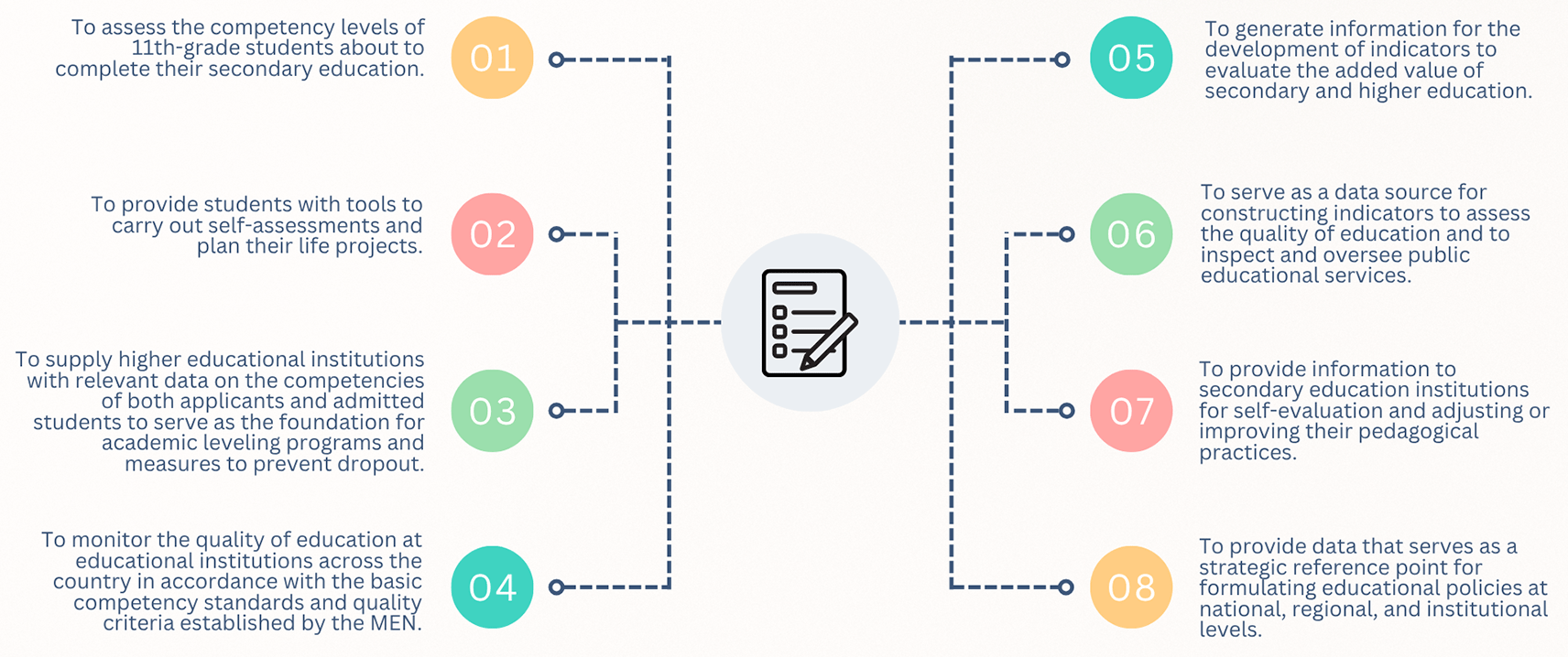 The Saber 11° exam is conducted at the end of eleventh grade to provide an official assessment of the quality of formal education amongst students completing secondary school. Moreover, under current regulations (ICFES, 2023), this exam can also be taken by individuals who have already obtained a high school diploma or have passed a high school validation test. The objectives of the Saber 11° exam, as stipulated in Decree 869 of 2010, are summarized in Figure 1.
