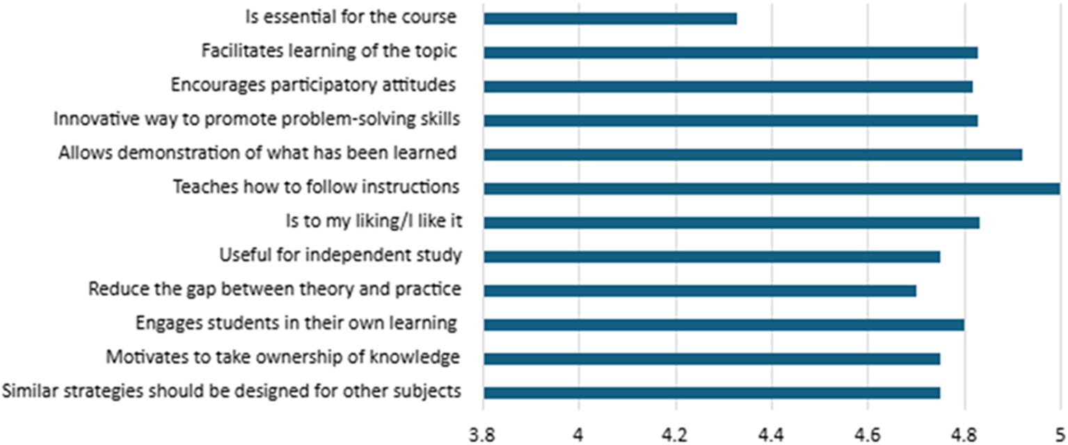 Other highly rated items (≥4.7) include “innovative way to promote problem-solving skills” (4.83), “facilitates learning of the topic” (4.83), and “engages students in their own learning” (4.80). These results indicate that the strategies significantly contributed to the development of higher-order competencies, such as problem-solving, deep understanding of content, and active engagement in the learning process.