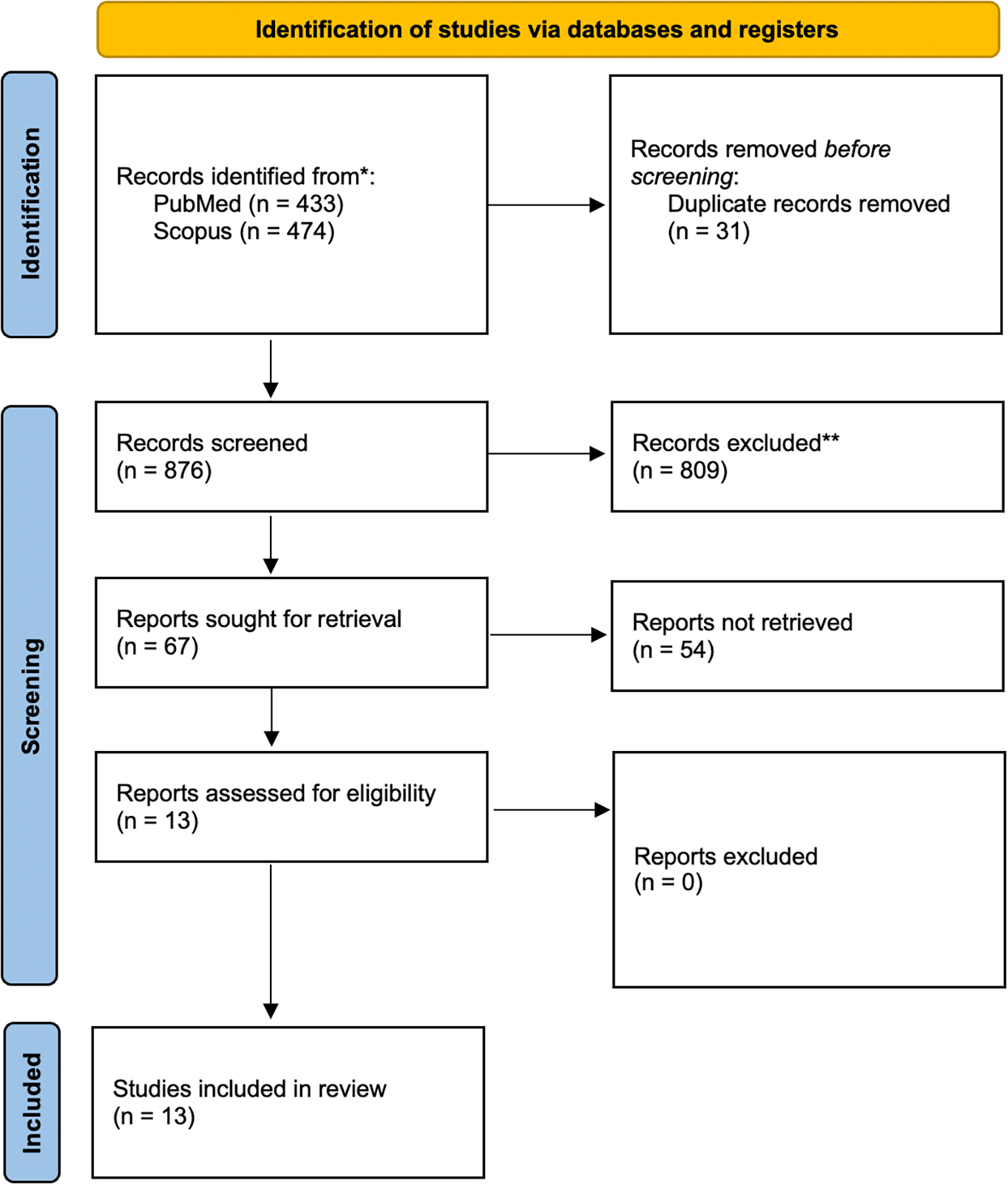 As shown in Figure 1, a total of 907 records were initially retrieved from accredited databases, Scopus and PubMed. After removing 31 duplicate records, 876 studies remained for screening. Applying the PEO framework, 809 studies were excluded. Finally, 13 articles were ultimately included in the final review. These 13 studies14–26 comprised a total of 19,312 participants. The geographic distribution of the studies included three from Iran, two from China, two from the United States, and one each from France, Ethiopia, Sweden, Thailand, Brazil, and Japan. Additional characteristics of the participants and study designs are detailed in Table 2.
