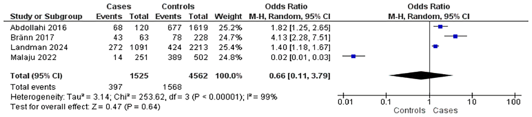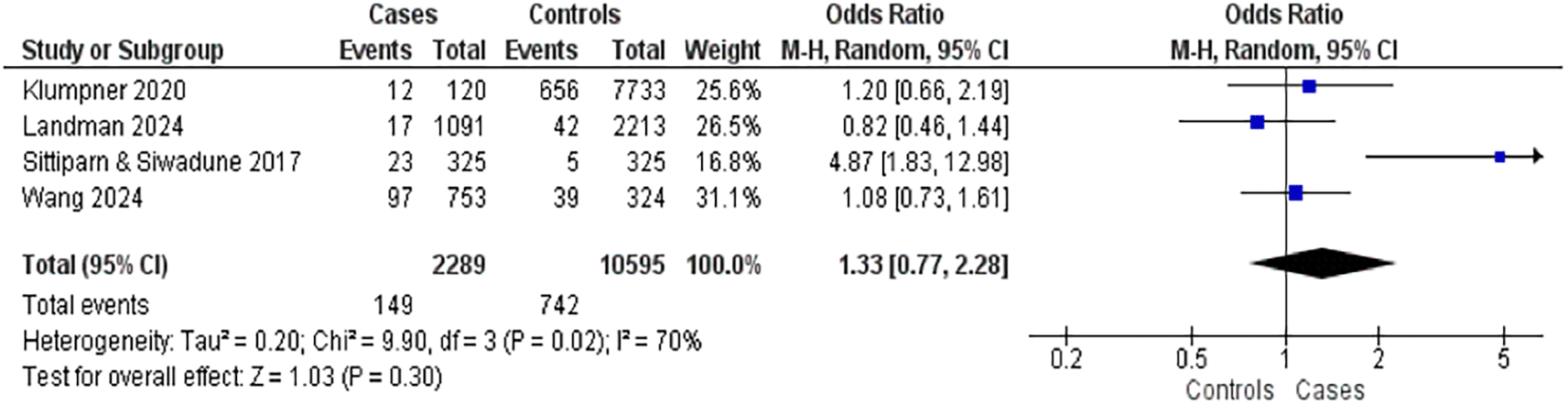 Four studies reported on the relationship between diabetes mellitus and postpartum complications ( Figure 5). These included three case-control studies with 2,289 mothers who experienced complications and 10,595 controls. Diabetes mellitus was associated with a slightly elevated risk of postpartum complications (OR = 1.33; 95% CI: 0.77–2.28; p = 0.30), the association was not statistically significant. However, high heterogeneity was observed among the studies (I2 = 70%), indicating variability in findings across the studies.
