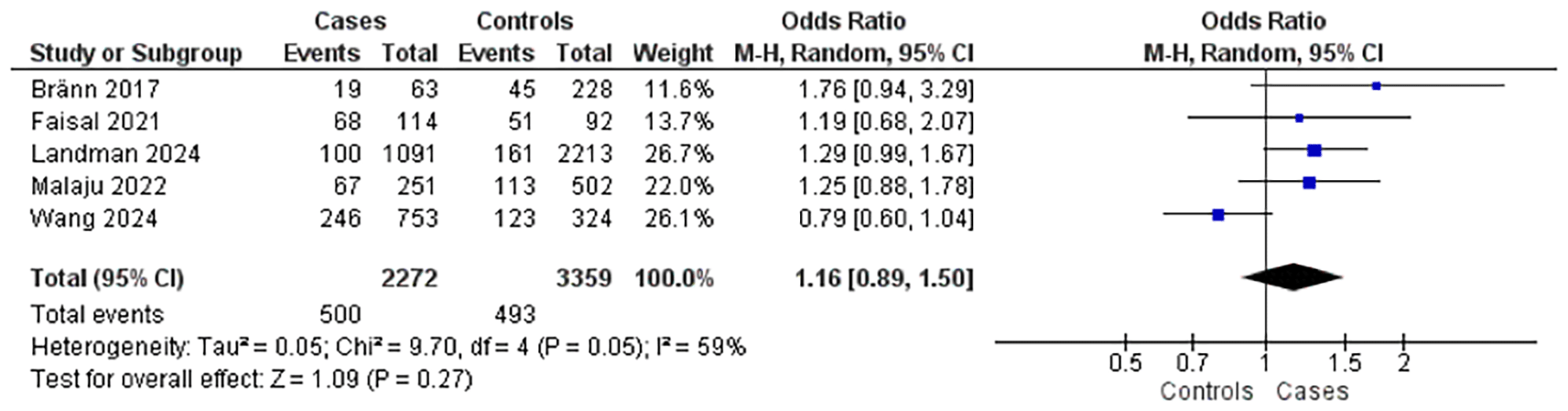 Five studies explored the relationship between maternal education level and postpartum complications ( Figure 3). These comprised five case-control studies with 2,272 mothers experiencing complications and 3,359 controls. Findings indicated that mothers with lower education levels had a slightly increased risk of complications (OR = 1.16; 95% CI: 0.89–1.50; p = 0.27), the association was not statistically significant. Moderate heterogeneity was detected among the studies (I2 = 59%).