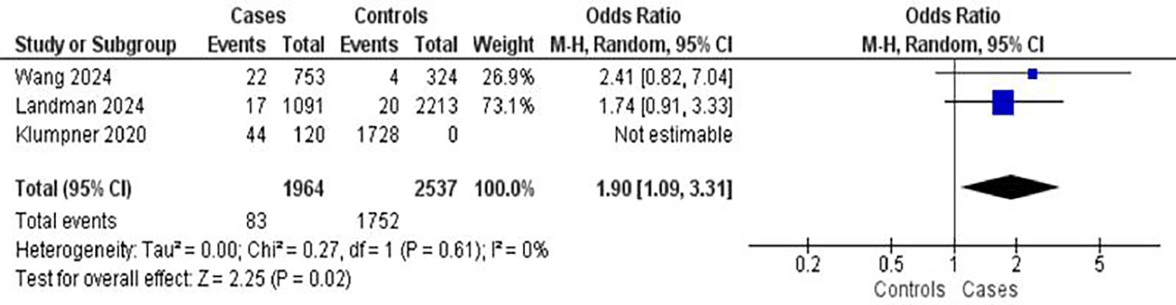 Three studies examined hypertension as a risk factor for postpartum complications, encompassing 1,964 mothers with complications and 2,537 controls ( Figure 4). Hypertension was associated with an increased risk of complications (OR = 1.90; 95% CI: 1.09–3.31; p = 0.02). There was low heterogeneity among the studies (I2 = 20%), suggesting relatively consistent findings.