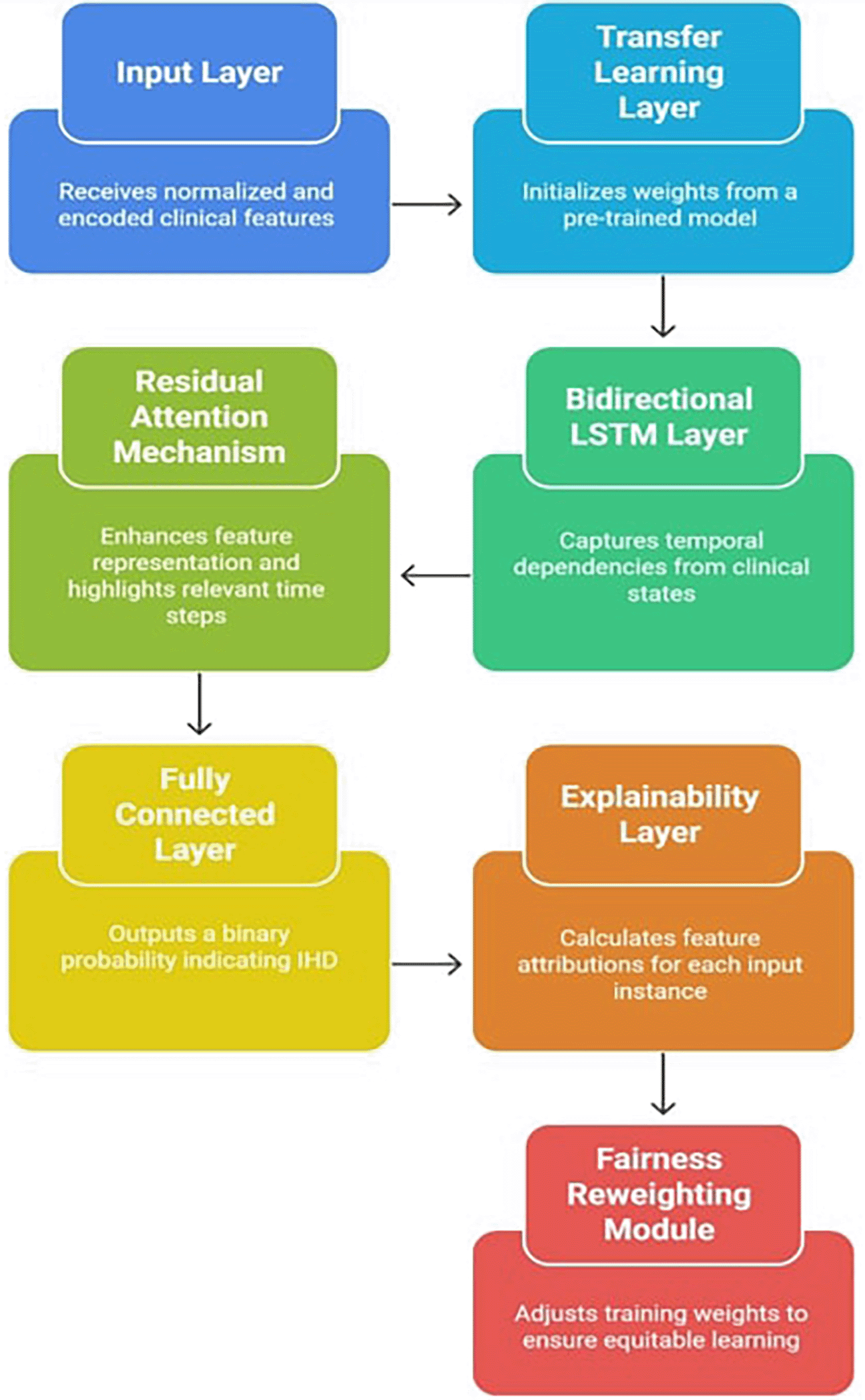 Our suggested model fills these shortcomings by integrating bias mitigation techniques, SHAP-based interpretability, transfer learning, and residual attention-enhanced BiLSTM into a single framework, creating a novel and comprehensive method for IHD diagnosis.