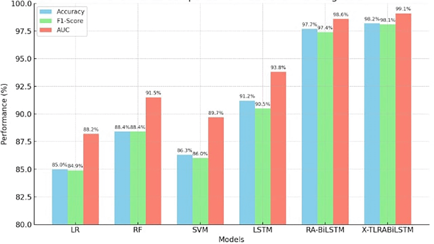 The classification performance of X-TLRABiLSTM is contrasted with several benchmark models in Table 3, such as Residual Attention BiLSTM (RA-BiLSTM), Logistic Regression (LR), Random Forest (RF), Support Vector Machine (SVM), and conventional LSTM. Tenfold cross-validation was used to assess performance.