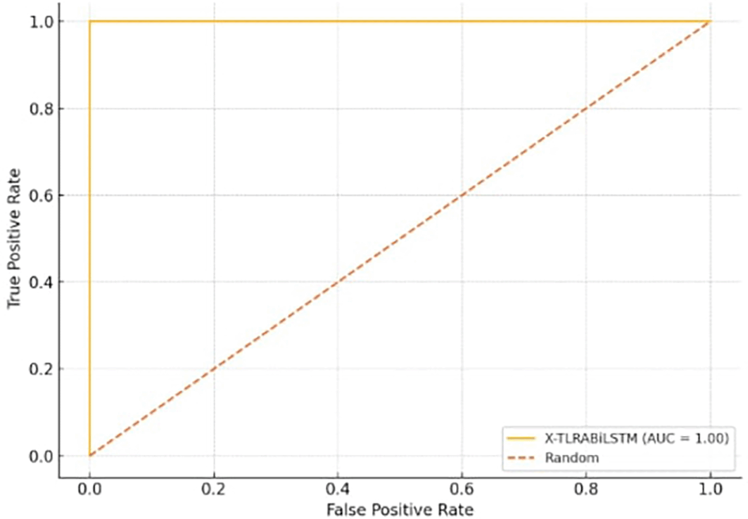 Figure 3 shows the trade-off between true positive rate and false positive rate, with AUC ≈ 1.00 for the X-TLRABiLSTM model.
