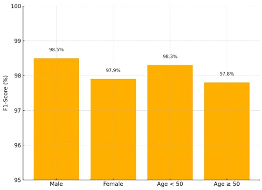 The fairness-aware demographic reweighting strategy ensured that the model achieved nearly equal predictive accuracy across the gender and age subgroups displayed in Table 4, according to the Fairness Gap values (≤ 0.6). Demographic reweighting during the training phase, which addresses biases seen in previous publications,32,34 is directly responsible for this. Figure 6 shows the F1-scores across demographic groups (Male, Female, Age < 50, Age ≥ 50), demonstrating balanced performance.