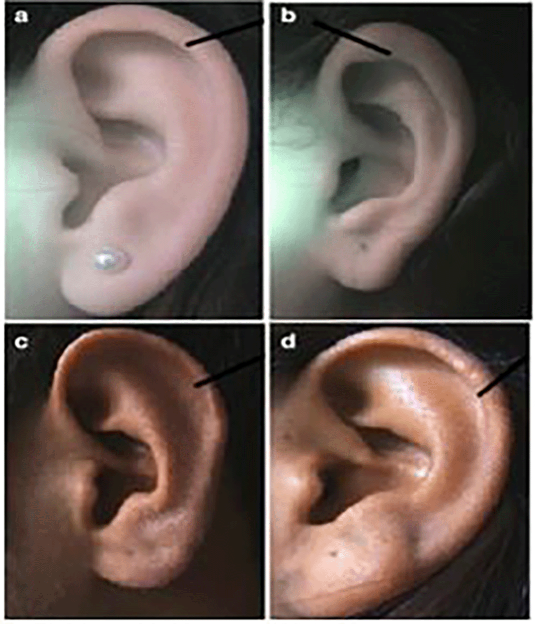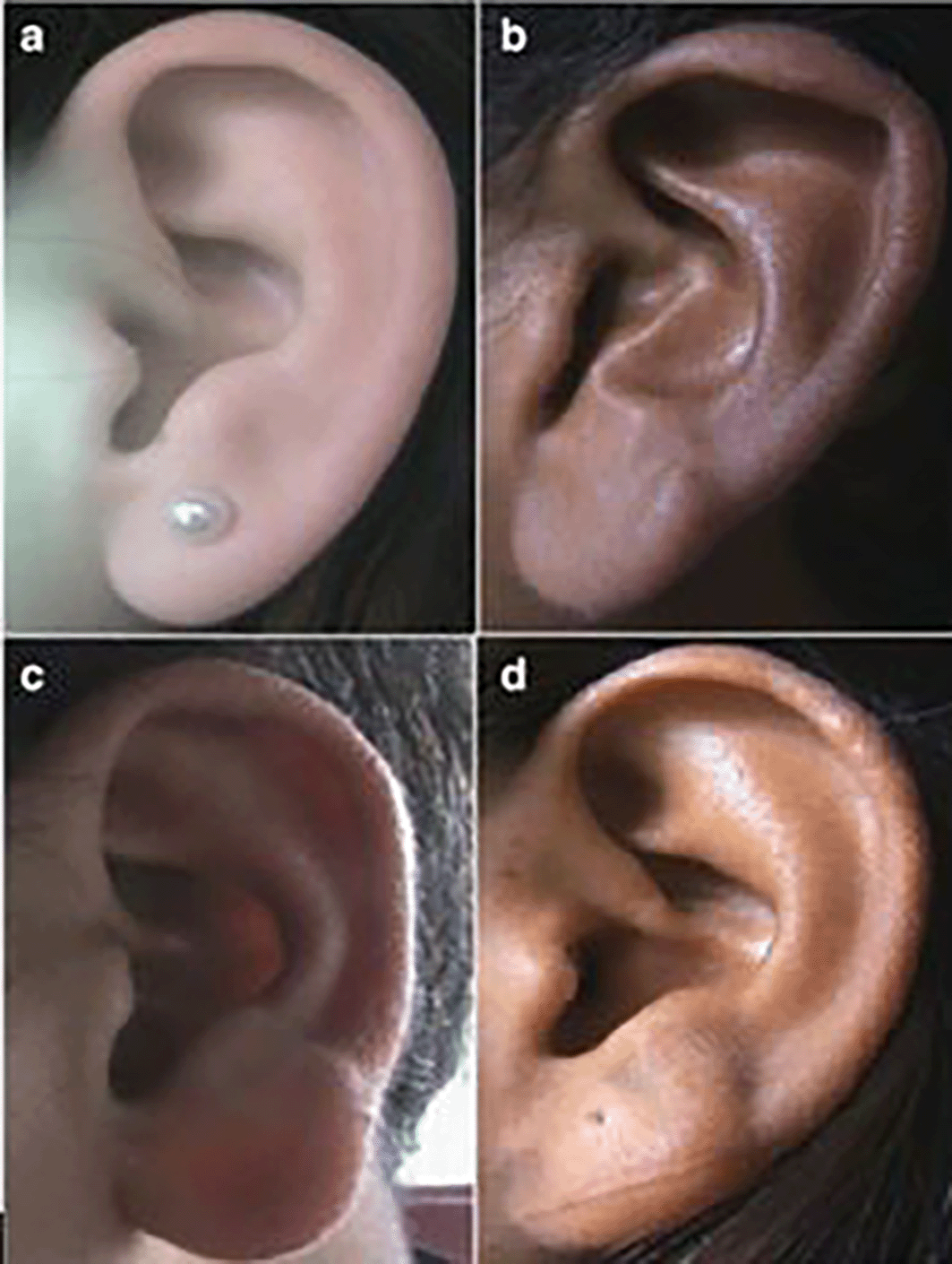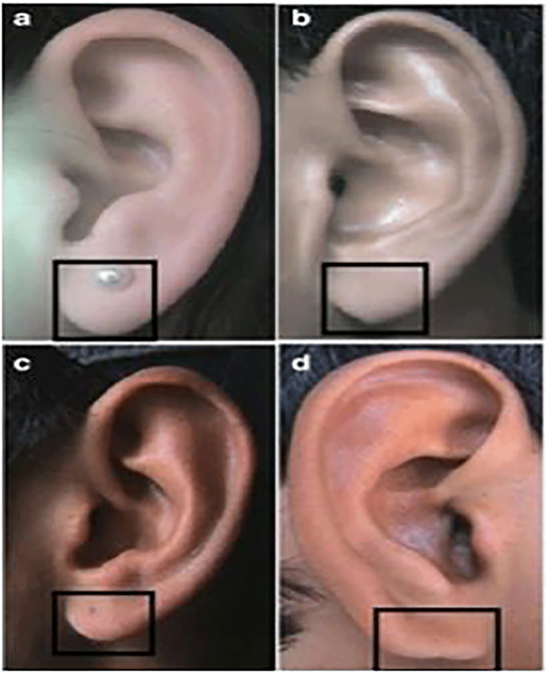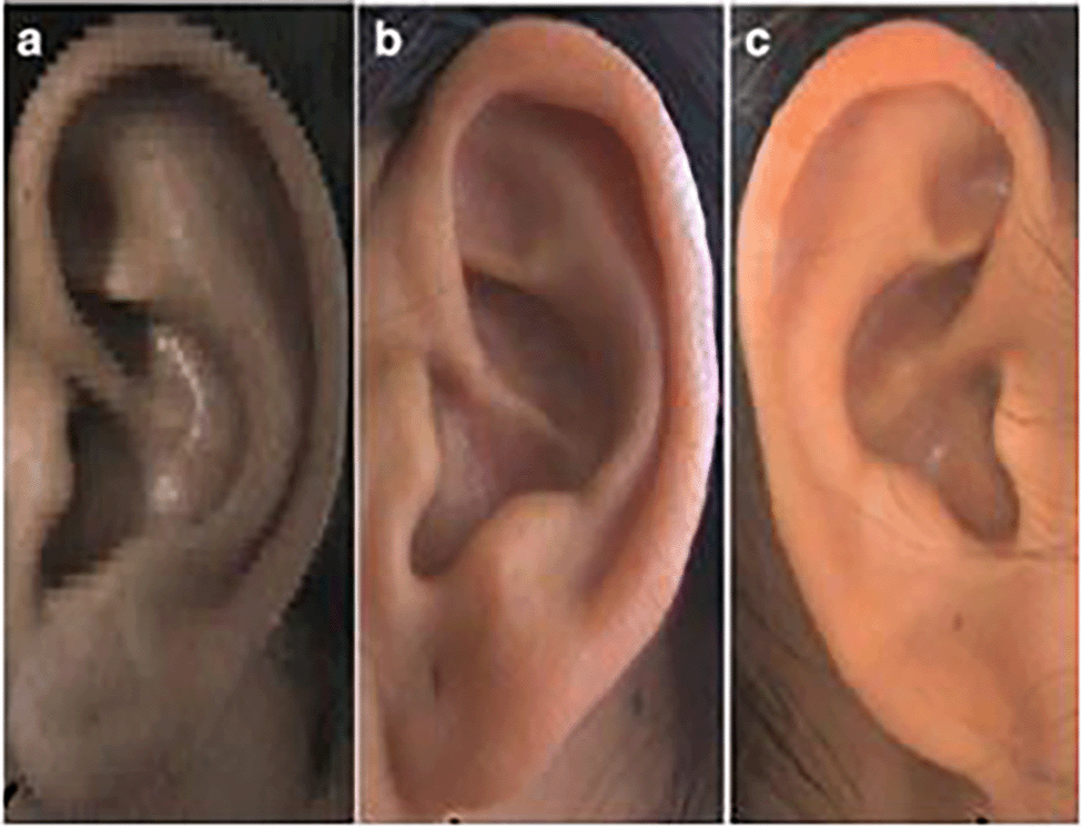 Some research papers have shown variation in ear shapes,16 varied types of helices and tragus, classification of Darwin’s tubercles, and varied types of ear lobes. The types of ear shape are oval, triangular, rectangular, and round. The helix of the ear can take various forms, including flat, gently curved at the edges, broadly covering the scapha, or the more common rolled form. The different lobule shapes are tongue-shaped, triangular, arched, square. The various types of earlobe attachment are classified as free, partially attached, and attached17–20 ( Figures 1, 2, 3, 4).