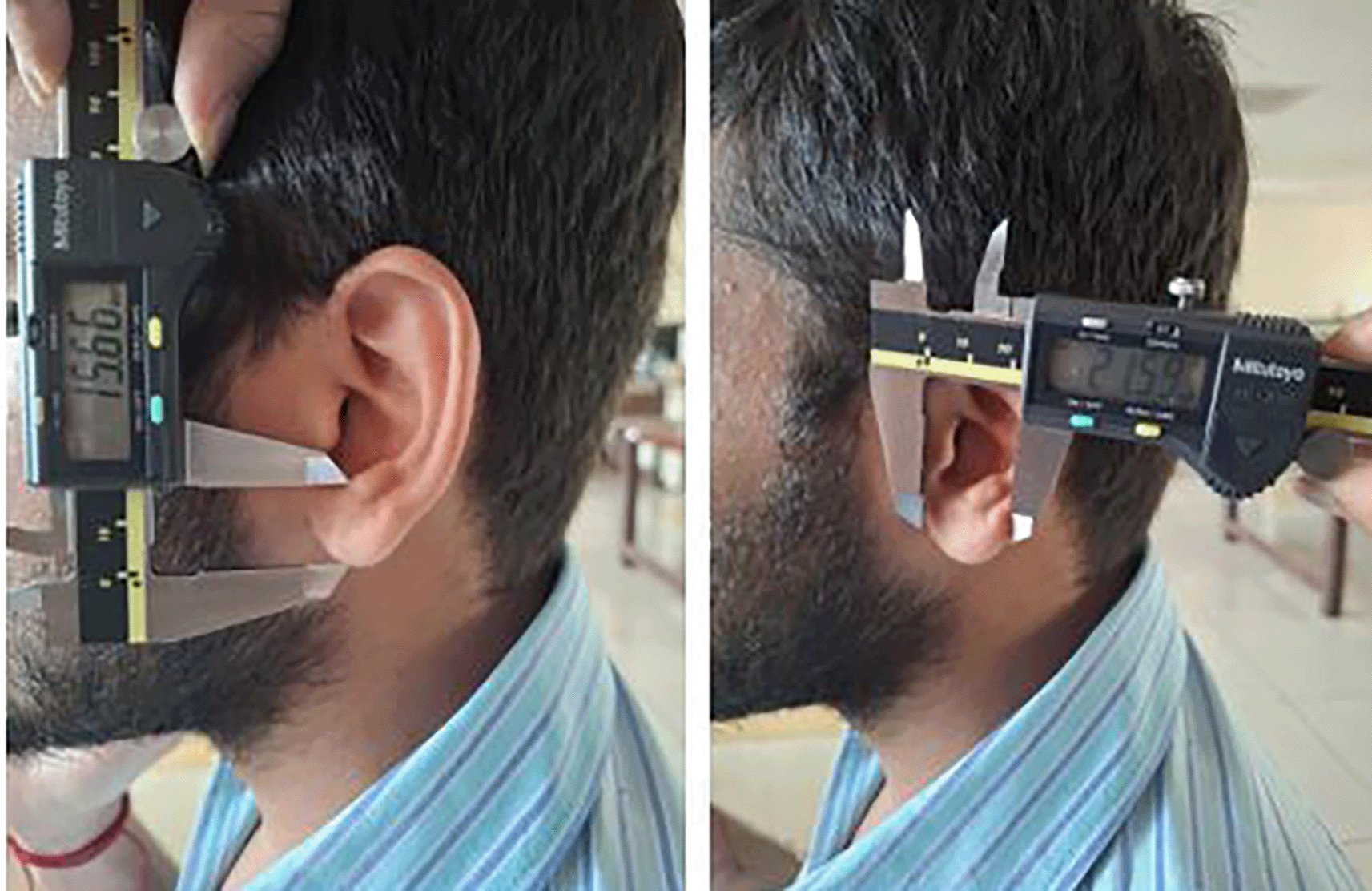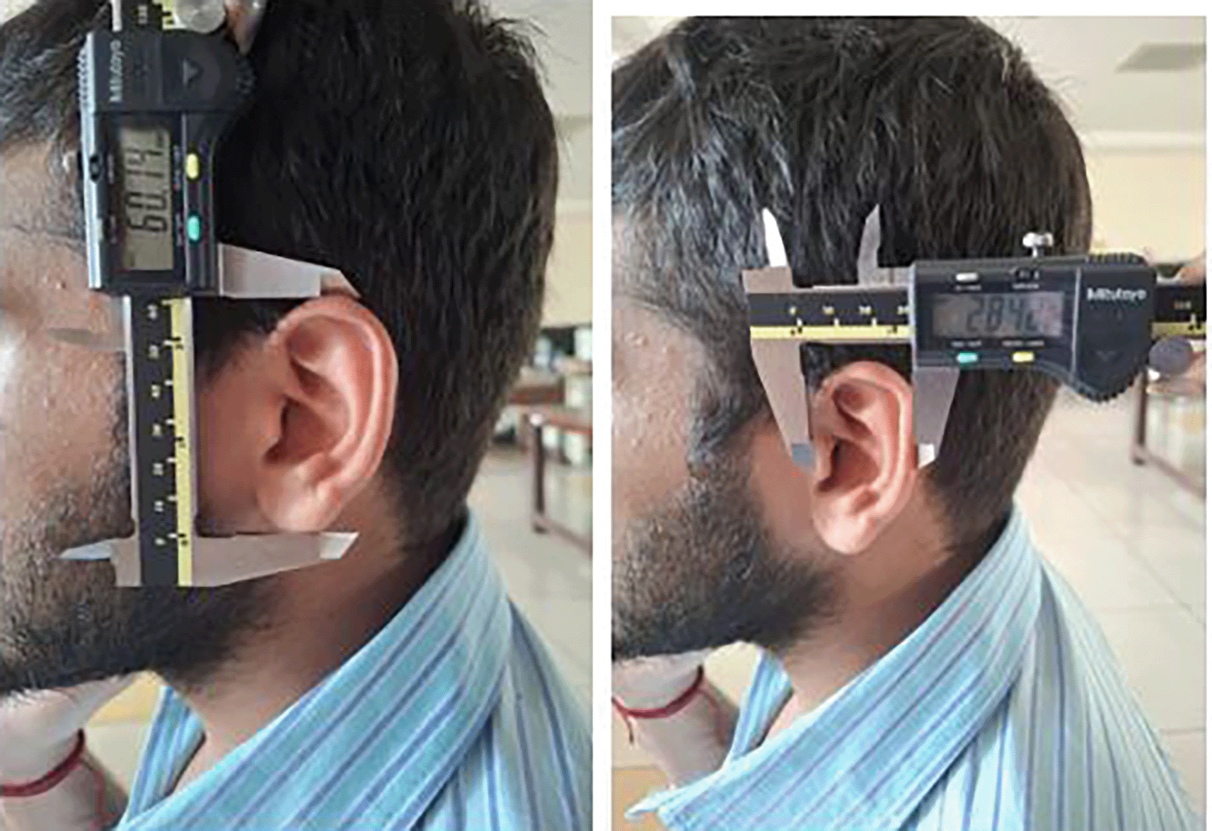 The study was conducted on 385 adult male individuals, aged between 18-50 years. The participants were students and professionals of MAHE, Manipal. A total of eight measurements were taken from both ears. The measurements included auricle length, auricle breadth, lobule length, and lobule breadth using a standard caliper, and stature was taken using measuring tape. Participants with deformed ears and female participants (wearing earrings), and also male participants wearing earrings were excluded. Written informed consent was taken from the participants before taking the measurements.
