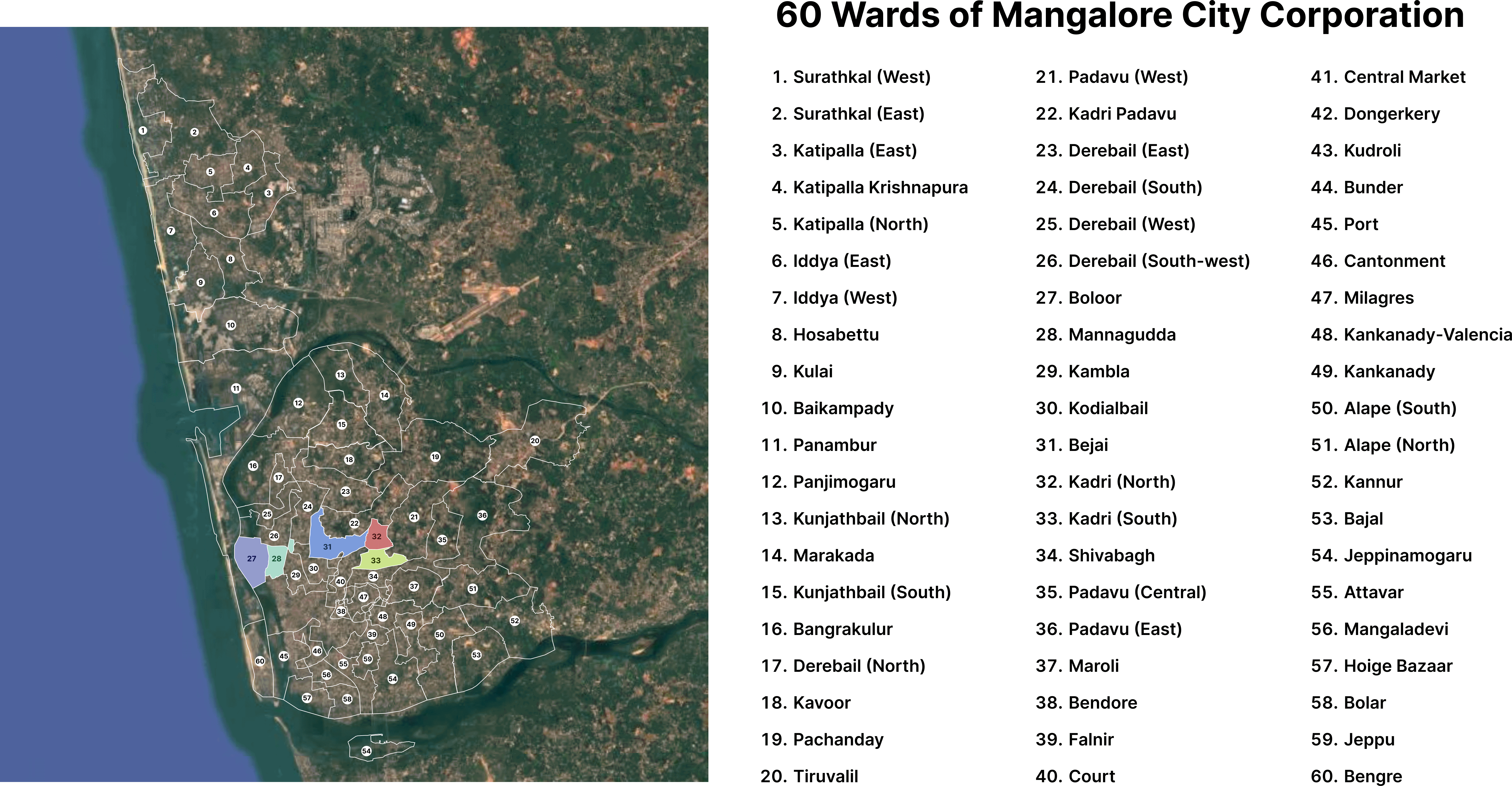 This community-based cross-sectional study was conducted in Mangalore, a coastal city on the western coast of Karnataka, a South Indian state. Mangalore with an area of 132.4 km2 is situated between 12°50′30″ N to 13°01′00″ N and 74°48′0″ E to 74°55′00″ E coordinates, is a tropical river basin, and has a humid climate of peninsular India. Mangalore is bounded by the western Ghats to the east, the Arabian Sea to the west, Kerala to the south, and the Udupi district to the north. Mangalore, the district headquarters of Dakshina Kannada, is administered by a city corporation founded in 1865 and consists of 60 wards.28 Wards 27, 28, 31, 32 and 33 were chosen as study areas (Figure 1). According to the Census of India 2011, the population of the Mangalore City Corporation was 499,487. In the absence of a more recent official census, population projections indicate that it may have grown to approximately 700,000 residents by 2024.29