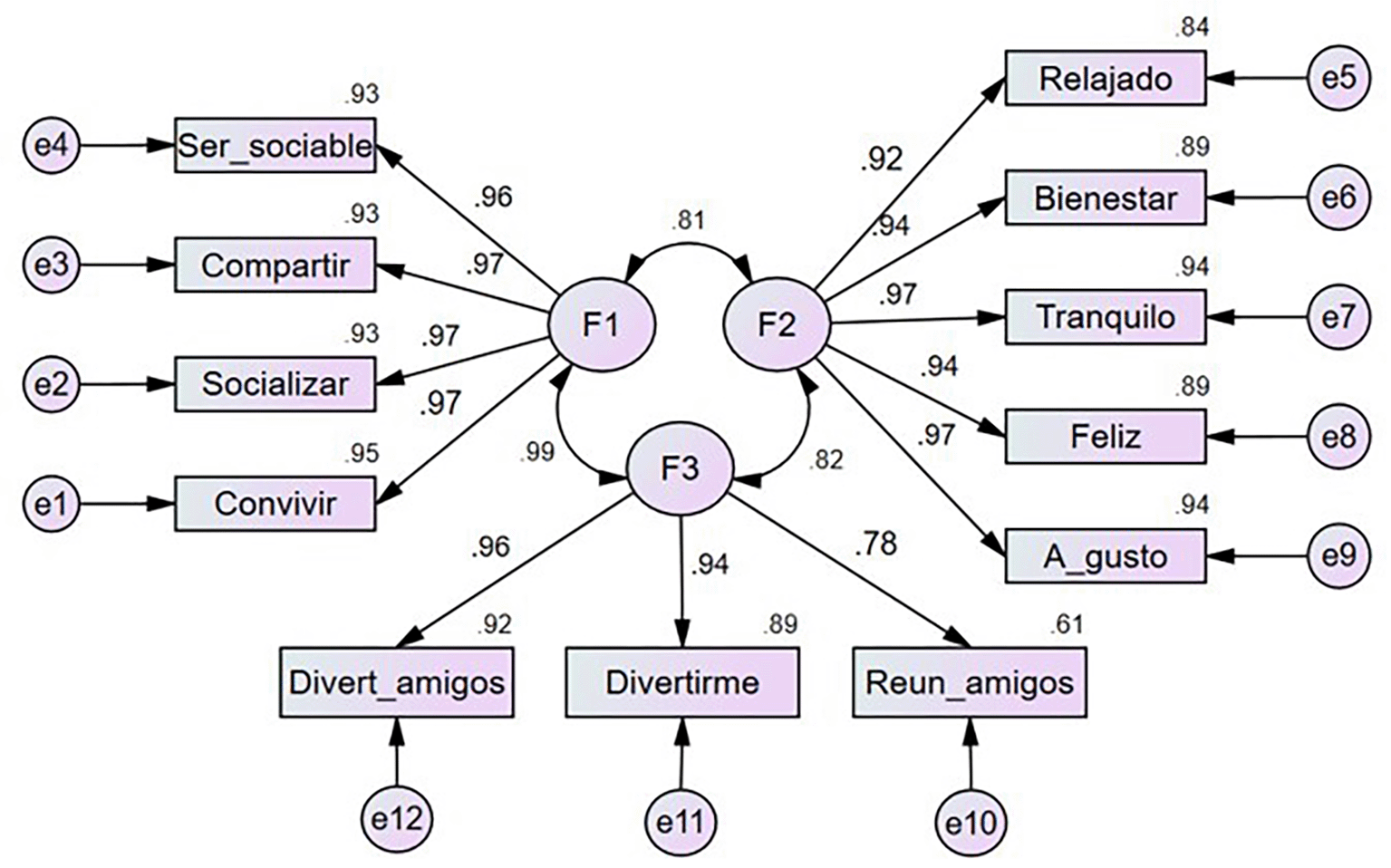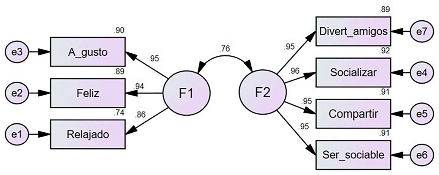 All the descriptive measures presented in Table 4 met the cut-off points specified by Ref.35,63,64 for establishing a good fit and align with the values reported in Ref.65,66 The cut-off points for the CFI, GFI, and RMSEA indices were superior to those reported by Ref.62 (0.90 for CFI and GFI, and <.08 for RMSEA) and those presented in other studies validating models of motivations related to alcohol consumption, such as Ref.60,61
