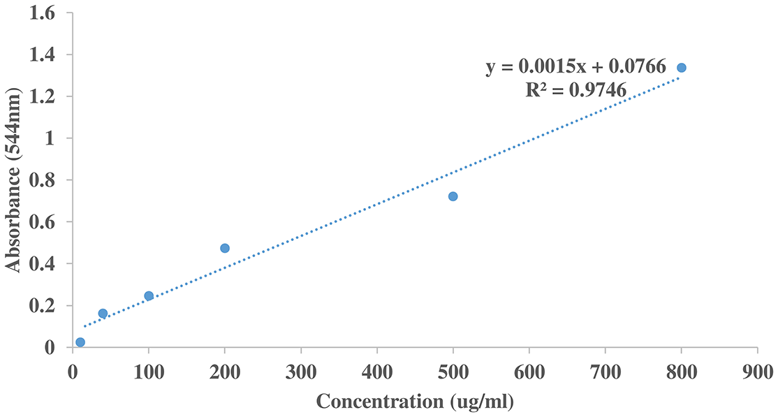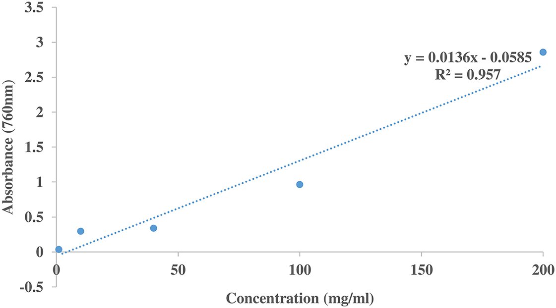 TSC was determined using the method described by Senguttuvan et al. (2014) with modifications. Each tube contained a normal aliquot (0.01, 0.2, 0.4, 0.6, 0.8, 1.0 and 1.2 mL) of diosgenin and a 0.25 mL aliquot of 1 mg/mL Catha edulis extract. Additionally, each tube received 0.25 mL of 8% vanillin reagent and 2.5 mL of 72% sulfuric acid. The mixtures were incubated in a water bath for 15 min at 60 °C and transferred to ice-cold water for 5 min. Absorbance was measured at 560 nm after cooling. The line of regression, y = 0.0015x + 0.0766; r2 = 0.9746 from the diosgenin standard curve was used to determine the TSC.
