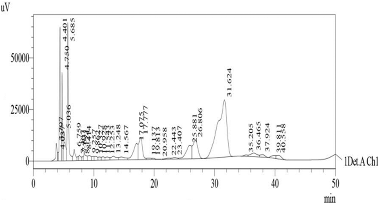 HPLC analysis of the lyophilized Catha edulis extract showed a diverse mixture of phytochemical components in its chromatogram featuring 34 individual peaks ( Figure 7). The different phytochemicals in the extract correspond to specific peaks showing their relative abundance based on their retention times measured in minutes. This study used fingerprinting as a chemical characterization method essential for quality control, standardization and comparative analysis between different Catha edulis varieties. The examined compounds exhibited retention times ranging from 3.797 to 40.558 min demonstrating the presence of polar and non-polar phytochemicals. Multiple high-intensity peaks emerged during the analysis at retention times of 4.401, 5.685, 17.777, 26.806 and 31.624 min. This peak at 31.624 minutes demonstrated the highest area percentage (33.048%) indicating its dominant presence in the extract. The peak table showing the retention time of the identified phytochemicals in the khat extract is presented in Table 2 (Mbina et al., 2025).