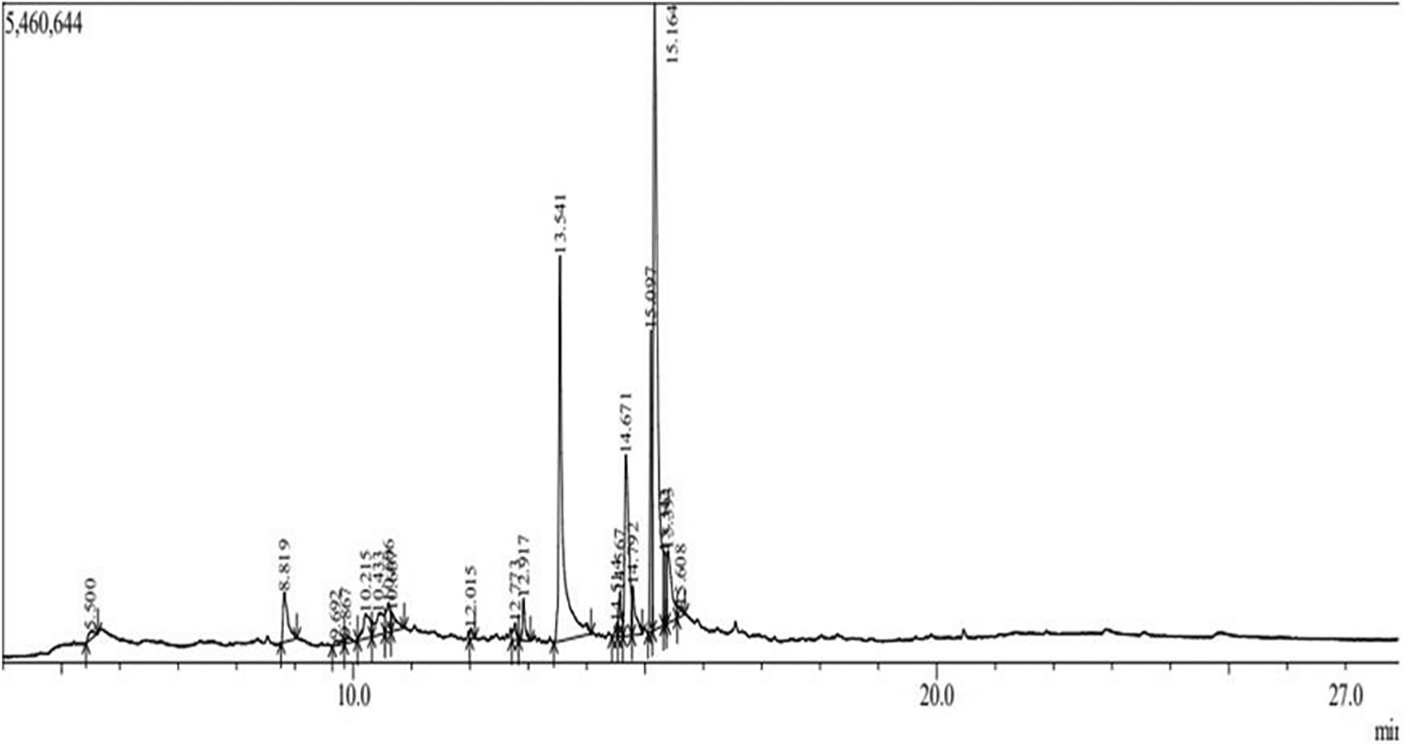 The presence of various bioactive compounds in the ‘Kasenge’ khat variety was identified using GC-MS (Model: GCMS-QP2020 NX, Shimadzu, Tokyo, Japan). The machine used Helium gas (99.999%) as the carrier gas with viscosity compressor time of 0.2 seconds, total flow of 50.0 mL/min at a washing volume 8uL. The analytical conditions for the experiment were optimized as follows: the injection temperature was set at 250.00 °C, while the ion source temperature was maintained at 230.00 °C. The column flow rate was controlled at 1.69 mL/min, with a linear velocity of 47.2 cm/sec. Mass spectrometry was performed with a scan interval of 0.5 seconds, capturing fragments within the mass range of 50-500 m/z (Dalton). The total GC running time was 28.00 minutes and the compounds were identified based on their retention time, retention indices, and mass spectra. To interpret the names, molecular masses and structures of the identified bioactive compounds in khat samples, the spectrum of the unknown compounds was compared with that of the known compounds domiciled in the database of the National Institute of Standard and Technology (NIST) library. The relative percentage concentration of each compound was determined by comparing its average peak area with the total area (Sharma et al., 2015).