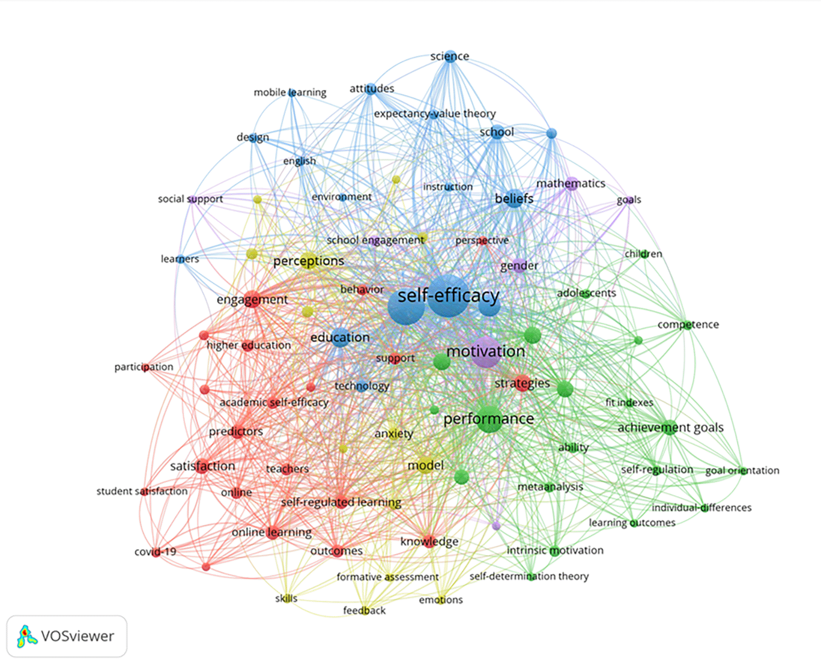 To survey the current research landscape, the author conducted a search in the Web of Science Core Collection in October 2025, using “interaction”, “self-efficacy”, and “learning achievement” as Topic terms. This study retrieved 465 articles and extracted five research topic and 80 items with a word frequency of over ten time (see Figure 1) after the keyword items visualization analysis in VOSviewer (Van Eck & Waltman, 2010). The research topics included (1) Factors Influencing Student Engagement and Satisfaction in Online Learning within Higher Education, (2) The Impact Mechanism of Motivation and Self-Regulation on Learning Achievement, (3) Factors Affecting Learning Achievement in Technology-Enhanced Learning Environments, (4) Psychological Drivers and Assessment Feedback Mechanisms in University Students’ Learning Achievement, (5) The Influence of Motivation and Social Support on Student Learning Engagement.