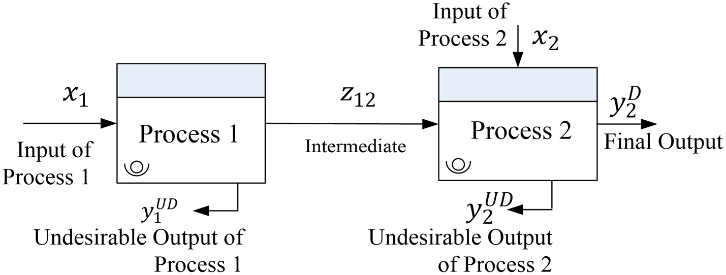 The figure illustrates the flow of desirable and undesirable outputs, including intermediate products (z12) between two processes, and the role of inputs (x1, x2) and final output (y2).