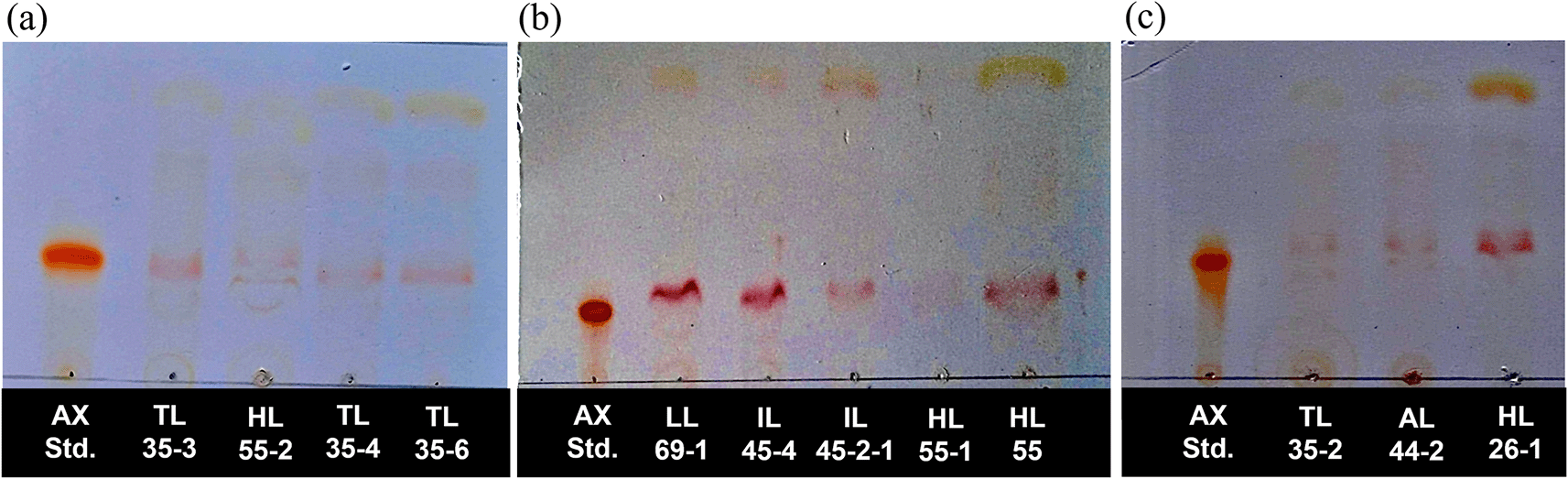 The presence of astaxanthin band of R. paludigena strain TL35-3, HL55-2, TL35-4, and TL35-6 (a), strain LL69-1, IL45-1, IL45-2-1, HL55-1, HL55 (b), and R. mucilaginosa strain TL35-2, AL44-2, and HL26-1 (c).