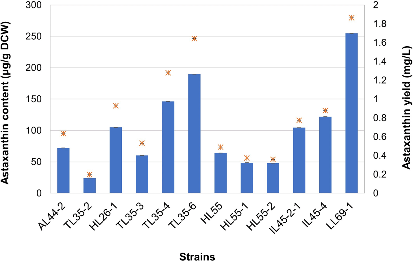 Twelve yeast strains exhibiting positive results in TLC analysis for astaxanthin were subjected to quantitative analysis using spectrophotometry. Intracellular astaxanthin was extracted from powdery cells using the conventional DMSO extraction method29 coupled with sound energy via an ultrasonic bath to enhance cell disruption efficiency.39 In the R. mucilaginosa strains, the astaxanthin content ranged from 23.99 ± 0.22 to 104.98 ± 0.13 μg/g DCW, with yields ranging from 0.1991 ± 0.0021 to 0.9280 ± 0.0012 mg/L ( Figure 2). Moreover, several R. paludigena strains exhibited astaxanthin contents and yields ranging from 47.99 ± 0.11 to 254.78 ± 0.27 μg/g DCW and from 0.3589 ± 0.0009 to 1.8632 ± 0.0023 mg/L, respectively ( Figure 2). Strain LL69-1 demonstrated the highest astaxanthin production of R. paludigena, with an astaxanthin content of 254.78 ± 0.27 μg/g DCW and a yield of 1.8632 ± 0.0023 mg/L. Meanwhile, R. mucilaginosa strain HL26-1, the highest producer of its species, which yielded 104.98 ± 0.13 μg/g DCW and 0.9280 ± 0.0012 mg/L.