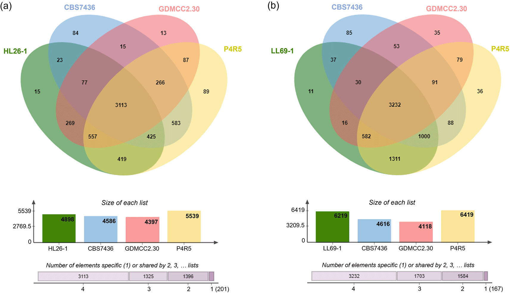 According to annotation results from the National Center for Biotechnology Information (NCBI) database, the draft genome sequence of R. mucilaginosa HL26-1 comprises 5,711 protein-encoding genes, while R. paludigena LL69-1 was predicted to contain approximately 6,782 coding genes. The Venn diagram in Figure 4 illustrates the genetic variations and distinct characteristics that differentiate the genomes of HL26-1 and LL69-1 from those of closely related species. The protein-coding sequences of HL26-1 and LL69-1, along with those of three other Rhodotorula species (R. kratochvilovae CBS 7436, R. mucilaginosa GDMCC2.30, and R. paludigena P4R5), were compared to examine the similarity of their protein sequences. This comparison revealed that R. mucilaginosa HL26-1, R. kratochvilovae CBS 7436, R. mucilaginosa GDMCC2.30, and R. paludigena P4R5 possess 15, 84, 13, and 89 proteins, respectively, which are exclusive to their respective species or strains. Additionally, 11, 85, 35, and 36 protein families were identified as being species- or strain-specific for R. paludigena LL69-1, R. kratochvilovae CBS 7436T, R. mucilaginosa GDMCC2.30, and R. paludigena P4R, respectively.