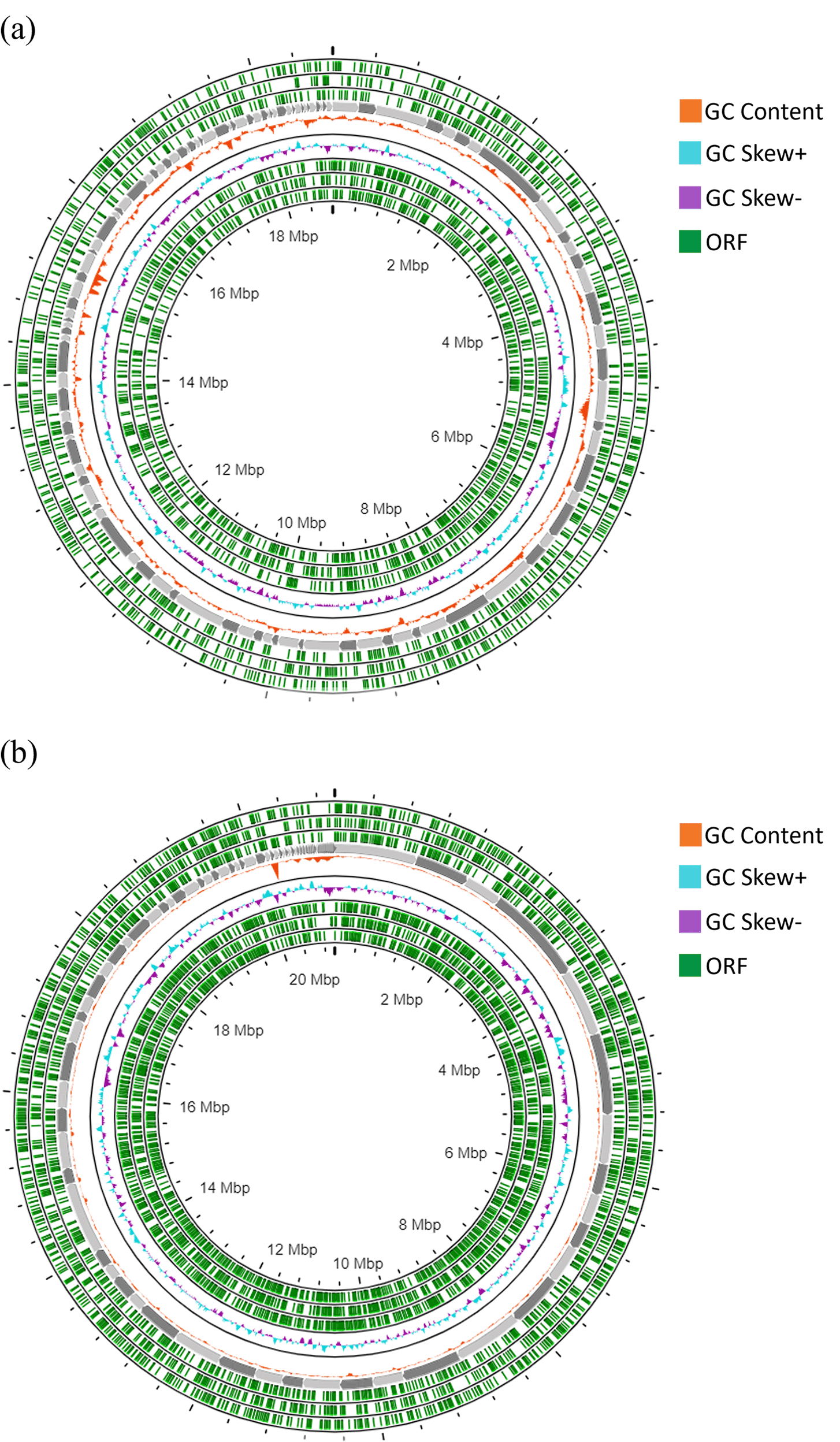 The genome assembly statistics for the two astaxanthin-producing yeasts, R. mucilaginosa HL26-1 and R. paludigena LL69-1, are presented in Table 1. The assembly of R. mucilaginosa HL26-1 resulted in 107 scaffolds, with the giant scaffold spanning 853,611 base pairs (bp). The N50 length of the scaffolds was 193,129 bp, with a GC content of 60.12% and a genome size of 18.78 Mbp. Conversely, R. paludigena LL69-1 had a genome size of 20.99 Mbp, with a GC content of 63.82%. Its assembly comprised 107 scaffolds with an N50 value of 476521 bp and an L50 value of 24 scaffolds. The largest scaffold in LL69-1 was 1,230,191 bp, whereas the shortest was 524 bp. Circular genomics of the HL26-1 and LL69-1 genomes, illustrating the open reading frame (ORF) positions, GC content, and GC skew of each strain, are depicted in Figure 3. The whole-genome sequences of R. mucilaginosa HL26-1 and R. paludigena LL69-1 were deposited in the NCBI/GenBank database (http://www.ncbi.nlm.nih.gov), associated with the BioProject identities PRJNA1025132 and PRJNA1025134, BioSample numbers SAMN37714267 and SAMN37714269, and GenBank accession numbers JAZBNE000000000 and JAWJBI000000000, respectively.