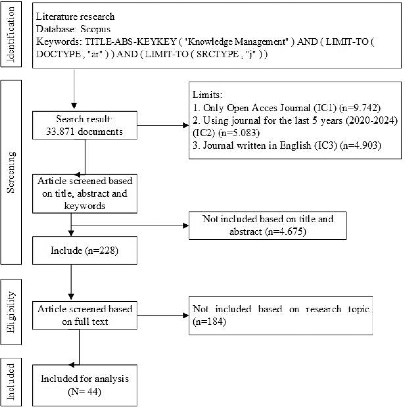 The research data from the SCOPUS database was retrieved using the following search terms: TITLE-ABS-KEY (“Knowledge Management”) AND (LIMIT-TO (DOCTYPE, “ar”)) AND (LIMIT-TO (SRCTYPE, “j”)). The initial search resulted in 33,871 articles. These articles were then filtered and selected based on the inclusion criteria specified in IC1-IC5 by reviewing their titles, abstracts, and keywords. This screening process reduced the selection to 228 articles, which were fully reviewed. After completing this thorough selection, 44 articles were chosen for further examination.