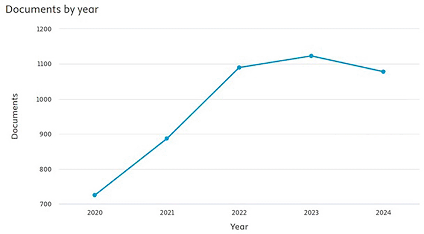 The chart in Figure 2 shows the progression in the number of publications focusing on knowledge management over the years. Between 2020 and 2022, the number of documents increased considerably, indicating a rising interest in knowledge management as a research area. This growth could be linked to heightened awareness of its role in supporting digital transformation and organizational adaptability. By 2023, the number of publications reached its peak, exceeding 1,100, showcasing the topic’s prominence and relevance during that year. However, a slight decline in the number of documents occurred in 2024, which may point to a shift in research priorities, the conclusion of significant studies, or natural variations in publication patterns. The chart reflects the growing importance of knowledge management as a research field, driven by organizational demands in an increasingly digital and dynamic environment.