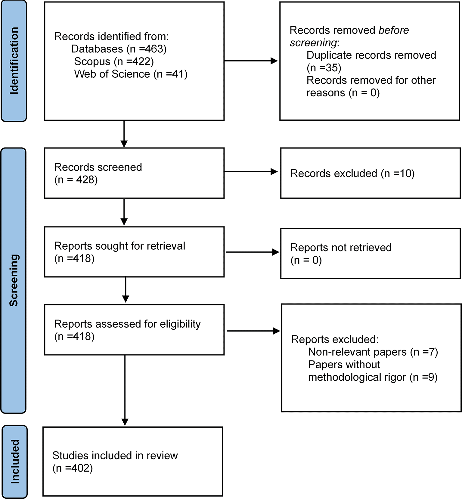 With regard to the exclusion criteria, two distinct phases were conducted in accordance with the PRISMA-2020 guidelines. The initial phase, designated as the screening phase, entailed the exclusion of articles exhibiting indexing inconsistencies or substantial errors, such as the absence of authors or the failure to document the country of publication in their metadata. These elements are instrumental in elucidating the content, context, and quality of the primary data. Furthermore, articles deemed irrelevant following a preliminary assessment of their general information were excluded from the study. The objective of this phase was to ascertain that the included studies satisfied the essential criteria of quality and relevance. The subsequent phase, entitled “eligibility,” entailed a more detailed evaluation to exclude those articles that did not meet the requisite methodological and scientific rigor. At this stage, the remaining studies were subjected to a more rigorous examination to ascertain their suitability as a basis for analysis. This entailed a comprehensive assessment of the quality of the research design and the transparency of the methodology employed, in order to ascertain their suitability as a basis for analysis.