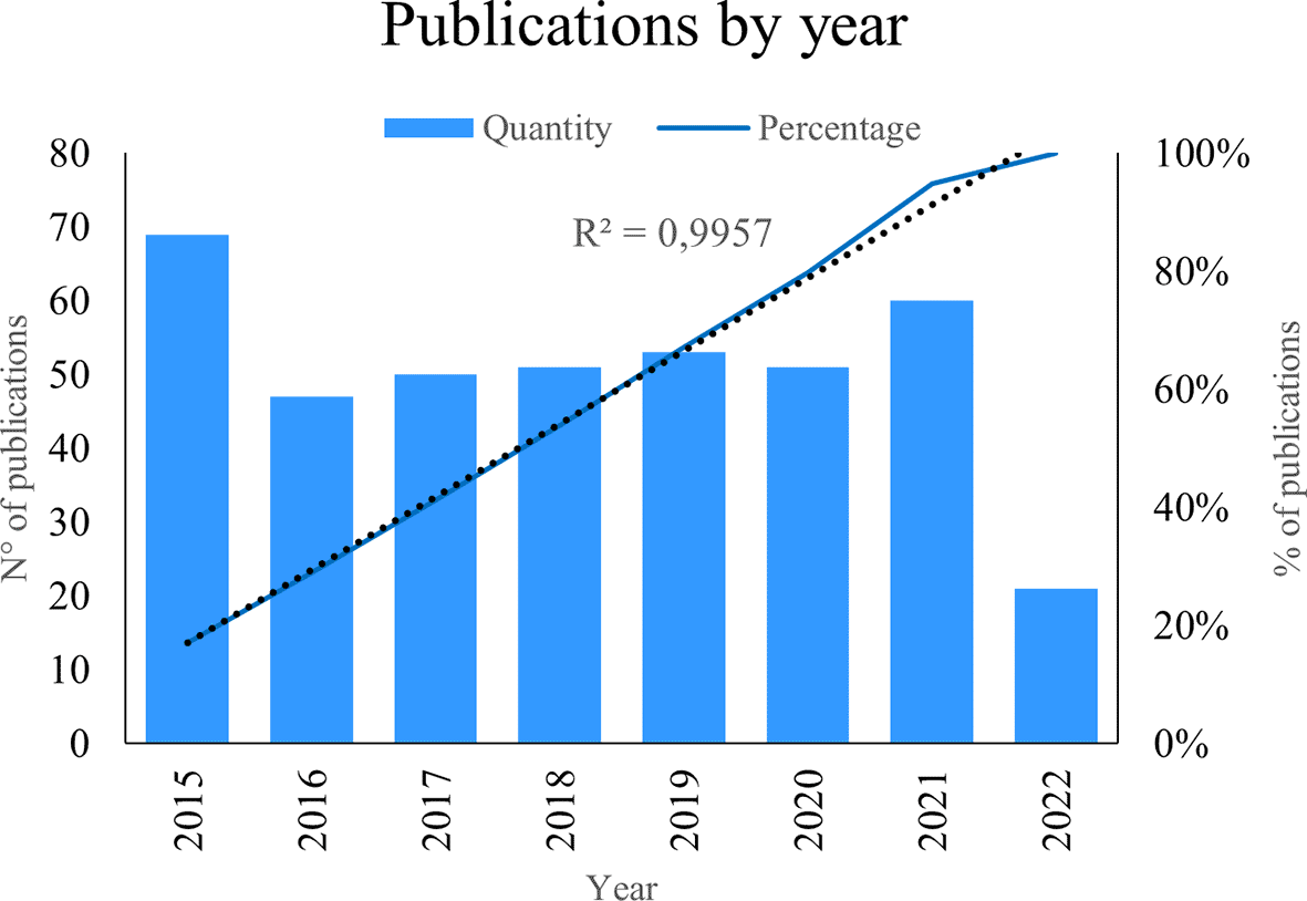 The initial presentation is of the quantity per year indicators. Figure 2 illustrates that the number of studies on food sovereignty indexed in the Scopus database increased between 2015 and 2022. Furthermore, there is evidence of linear 99.5% growth of the thematic, with the year with the highest academic productivity being 2015. In that year, a total of 69 publications were produced, including articles examining the potential and limitations of food sovereignty for health,23 for profit maximization, particularly in the rural sector,24 and others. The year 2021 presented an accumulated 58 publications related to the central thematic. The third term includes the year 2019, in which a total of 53 studies were published. Another noteworthy year in terms of scientific publications related to food sovereignty was 2020, with a total of 52 publications. This period saw a notable focus on the exploration of agroecological and systemic thinking in the context of post-Covid-19 scenarios.25