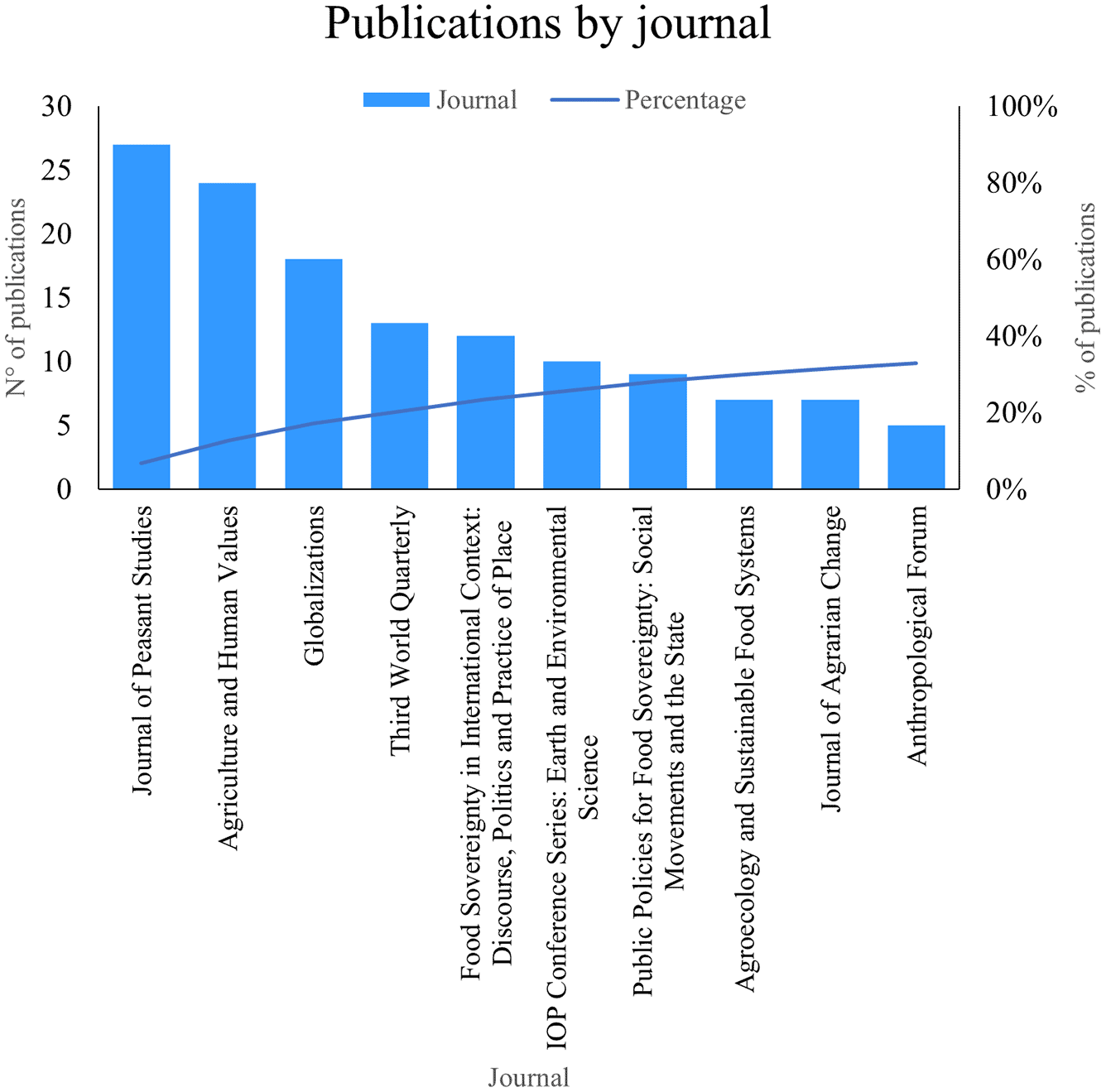 With regard to productivity by journals, Figure 3 illustrates that the Journal of Peasant Studies, based in England, has published the greatest number of articles on the subject of food sovereignty, with a total of 27 publications. The journal’s primary focus is on rural policy and development, as evidenced by the works of Dale30 and Meek & Khadse.31 The second-highest output was observed in the case of the journal Agriculture and Human Values from the Netherlands, which had 24 publications. This journal is dedicated to the interdisciplinary study of the humanities, social sciences, and agriculture from ethical and social perspectives, as evidenced by the works of Ahmad et al.32 and Price et al.33 Conversely, Globalizations has published 18 articles on the topics of food sovereignty and security. Therefore, with regard to productivity by journal, it is evident that, as illustrated in Figure 3, 32.08% of the journals have published 80% of their publications on food sovereignty, which is not in accordance with Pareto’s law.