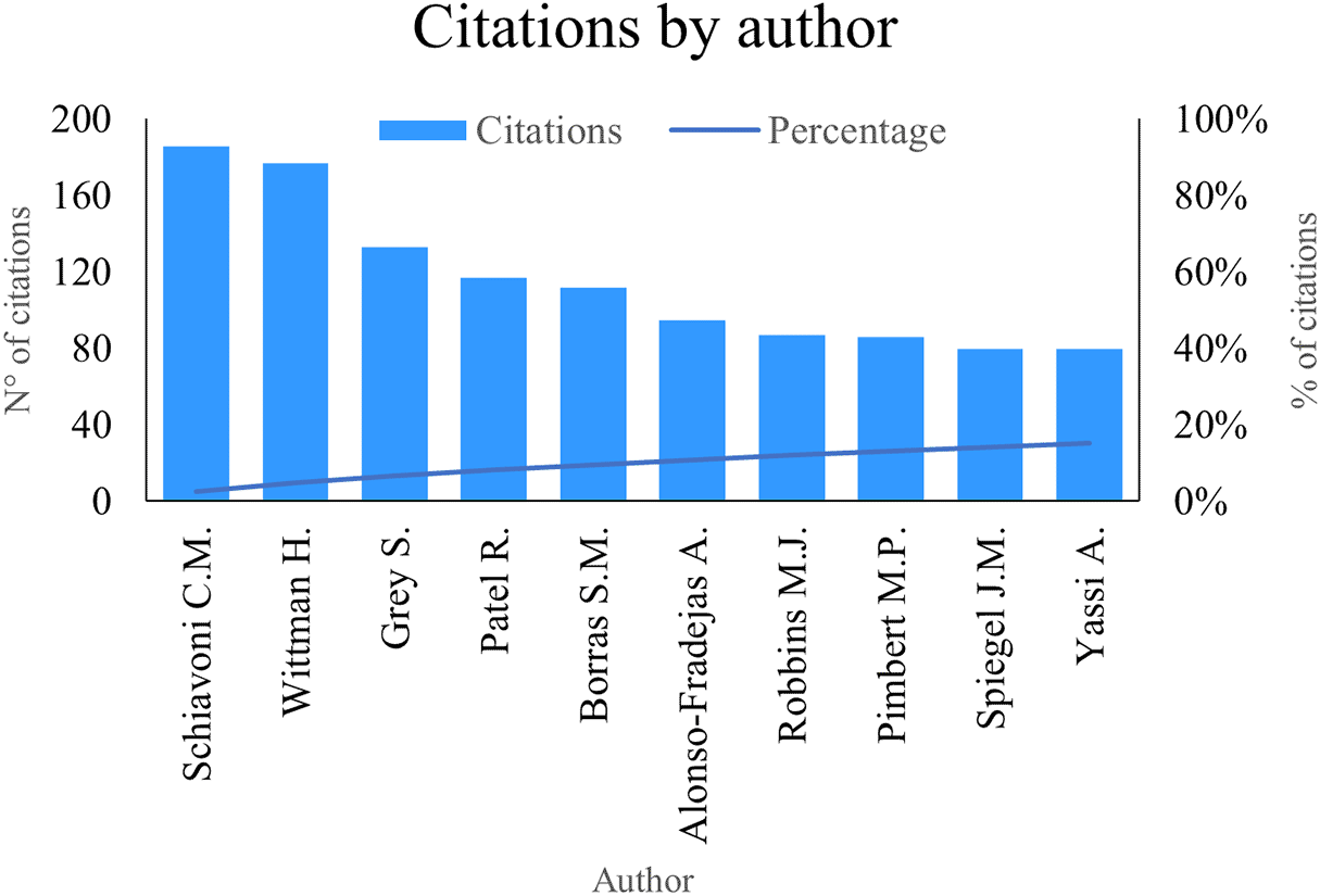 It is crucial to understand that the quantitative analysis of citations allows for the evaluation of an article’s impact within the academic community.34 Therefore, it is essential to calculate the number of citations in order to identify authors who have had the greatest impact on the academic community. In accordance with the preceding considerations, Figure 4 delineates the ten principal authors in terms of their citation and impact profiles with respect to studies on food sovereignty. The results indicate that Cristina Schiavoni, with a total of 181 citations, has the greatest impact on the academic community. Her research specialization is in the understanding of disputed lands and state-society interaction for the construction of food sovereignty.35,36
