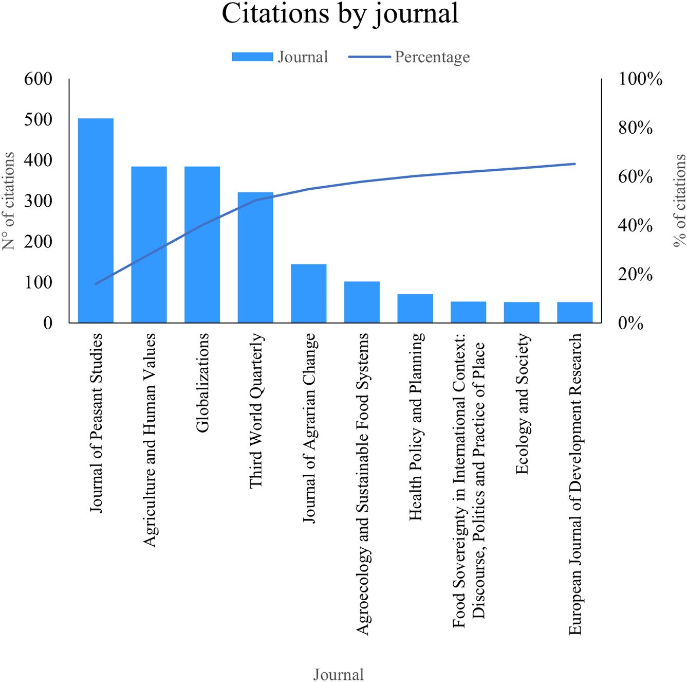 Furthermore, a statistical analysis reveals that a single journal, representing 0.03% of the total, accounts for 25% of the total number of citations. Three journals (0.1%) were responsible for 50% of the total citations in works focused on food sovereignty, while 20 journals (0.64%) accounted for 75% of the total citations. Finally, given that 0.84% of journals received 80% of the citations in the subject area, it is evident that the Pareto principle is not satisfied.